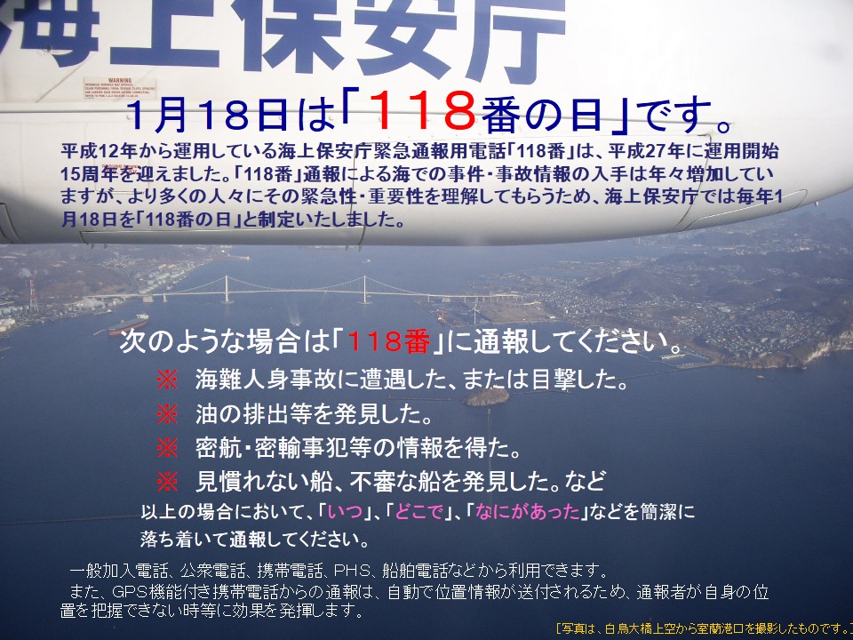1月18日は、 「118番の日」です。 b>「118番通報」の運用開始から15年経過→詳細はこちらから |