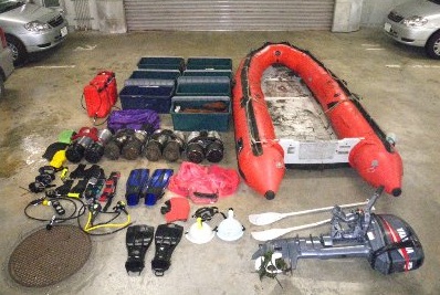 | 【潜水器使用による密漁】 管内は「なまこ」、「うに」等の好漁場となっていることから、これらを狙った大がかりな潜水器密漁グループが横行しているため、取締りを強化しています。 (管内で摘発した「なまこ潜水器密漁」に使用された道具、漁獲物約0.3トン) |