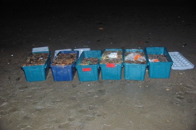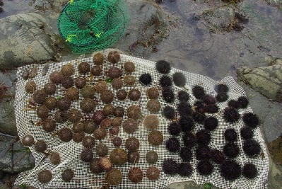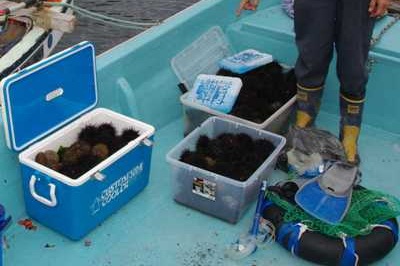 | 【一般市民により横行する密漁】 一般市民による徒手採捕が横行し、漁業者の権利を侵害している事犯が後を絶たないため、取締りを強化しています。 (違法に採捕された「うに」) |