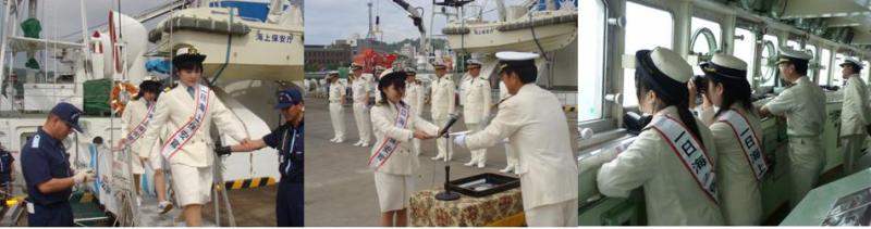 「巡視船えとも」による体験航海に先立って、室蘭海上保安部長から任命された「一日海上保安官」の活動(乗船・下船、「一日海上保安官」任命式、巡視船えとも船橋における前方監視の状況)