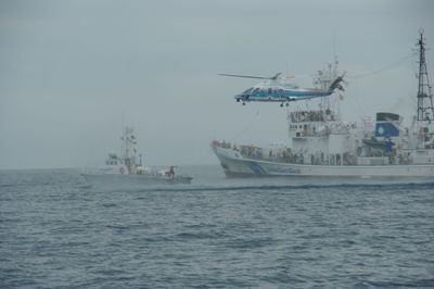 体験航海中に巡視船えとも、巡視艇ちよぎく及び函館航空基地所属のヘリコプターによる救助訓練の様子