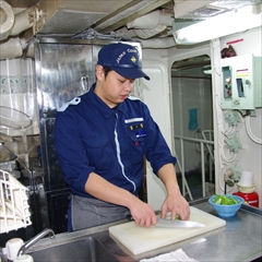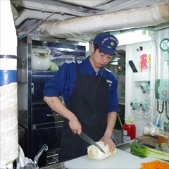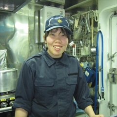 ・仕事内容は乗組員の食事を作っています、ほかにも制服等の物品の管理、事件が発生した際には警備業務を行っています。印象に残っている仕事は長期航海業務を初めて行ったとき、慣れないことが多く、大変だと思いましたが終わった後には充実感を感じることができました。