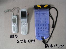 | 防水パックは縦型、2つ折り型の携帯電話 に対応しており、各メーカーからいろいろな種類の防水パックが発売されています。 | 海面に浮いている防水パック入りの携帯電話の状況 | ||