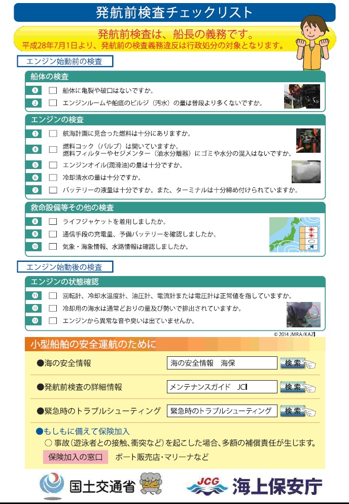 | なお、小型船舶操縦者の遵守事項である「発航前の検査義務」が平成28年7月1日から法定義務化され、違反者には違反点数が付されることになりました。 |