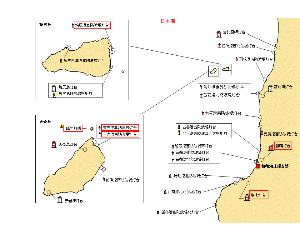 留萌海上保安部は、留萌振興局管内の灯台等の航路標識を管理しています。雄冬岬から豊岬に至る海岸線延長約120kmに設置した28基が対象です。 (沿岸灯台:7基、防波堤灯台:18基、灯標:1基、照射灯:2基)