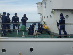 「国際航海船舶及び国際港湾施設の保安の確保等に関する法律」に基づき、テロリストの侵入及び不審物の持込を阻止するため、外国から入港する船舶への立入検査等を強化するなど、関係機関と連携した水際テロ対策を行っています。