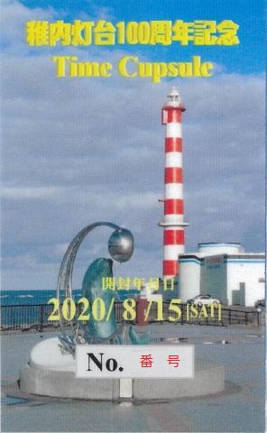 | 開封式は取り止めとなりました 今年8月15日に予定しておりました、タイムカプセル開封式につきましては、新型コロナウィルス感染症の拡大防止を考慮した結果、取り止めとなりました。 開封は当部職員にて行い、品物は希望により、保安部窓口又は郵送にてお渡しします。 詳細につきましては、下記のリンク(PDF資料)をご確認願います。 [稚内灯台「タイムカプセル」開封式の取り止めについて] | |