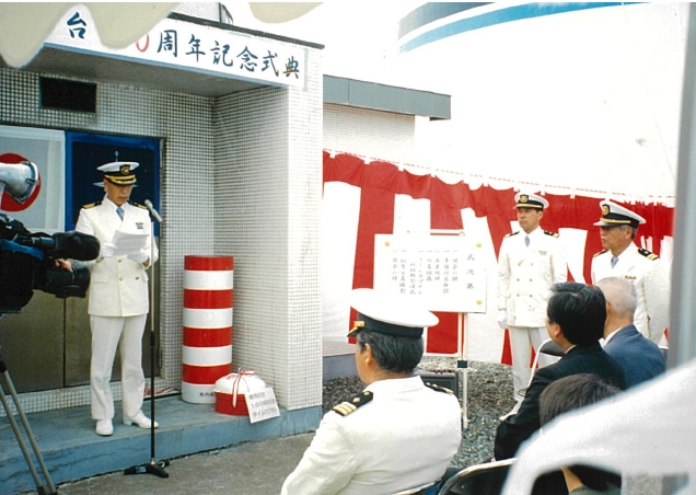 | 【記念式典で挨拶する当時の航路標識事務所長 右がタイムカプセル】 | |