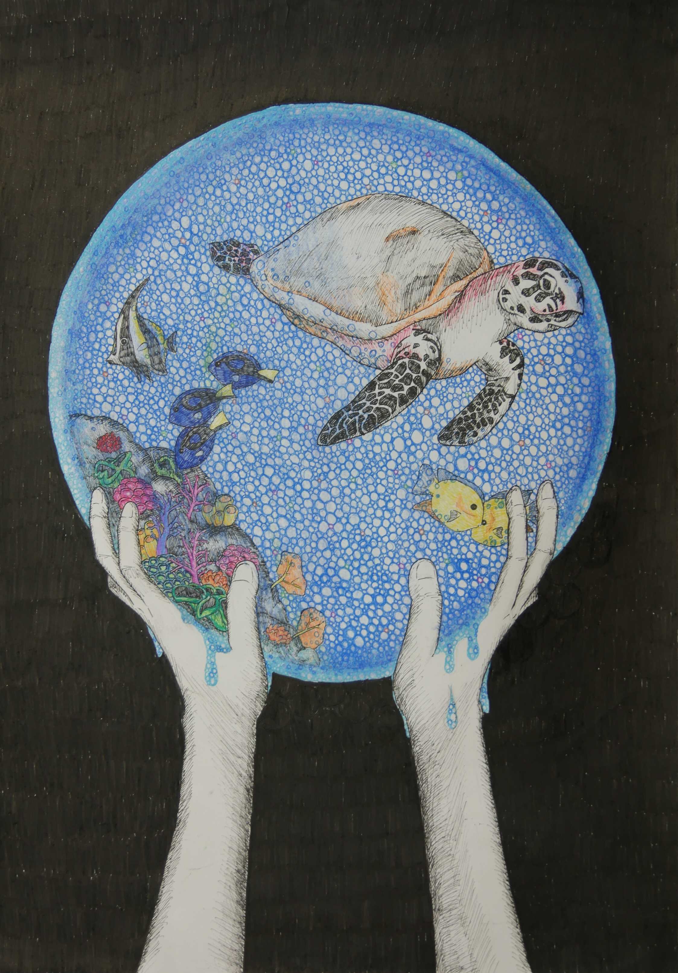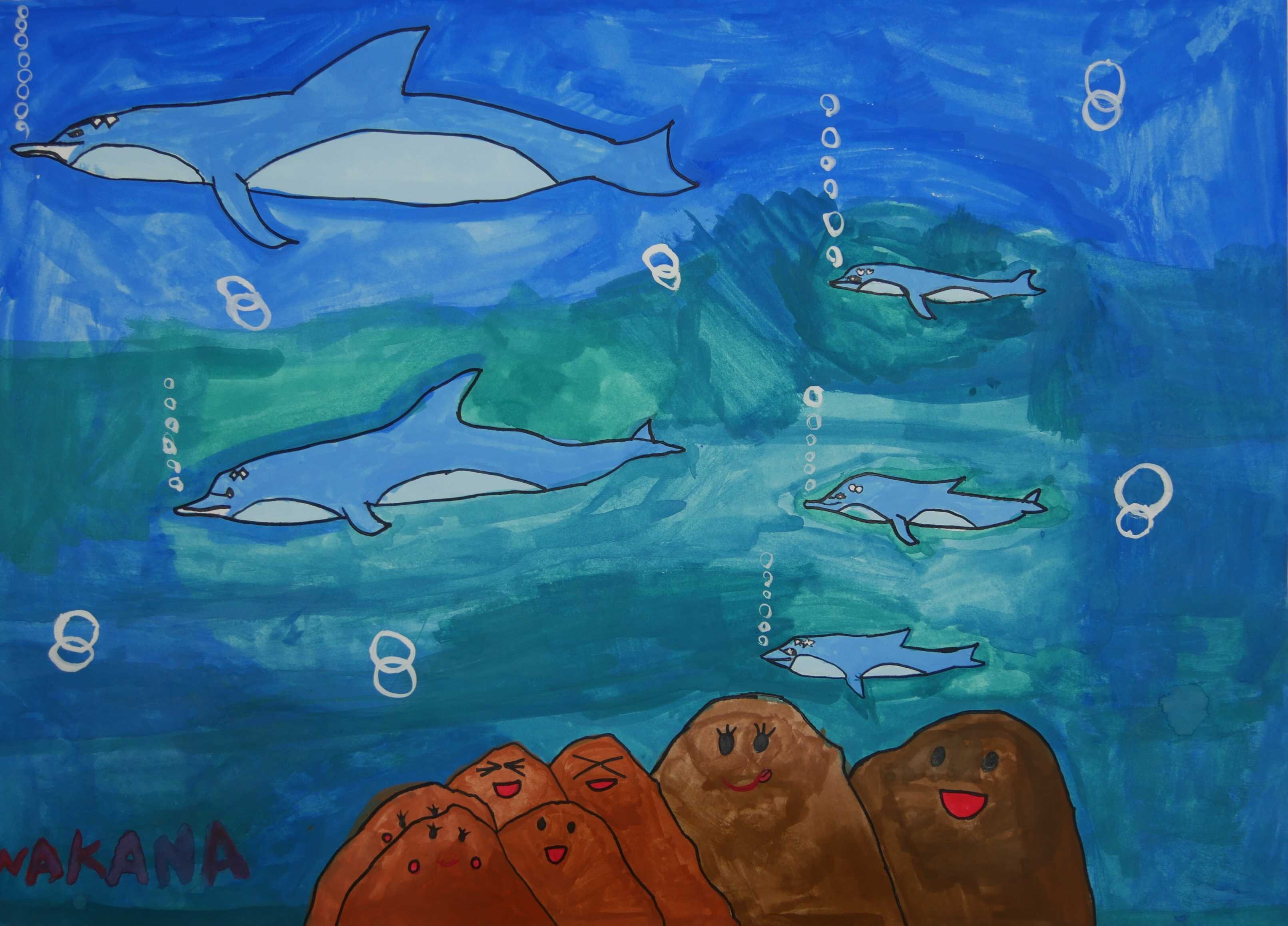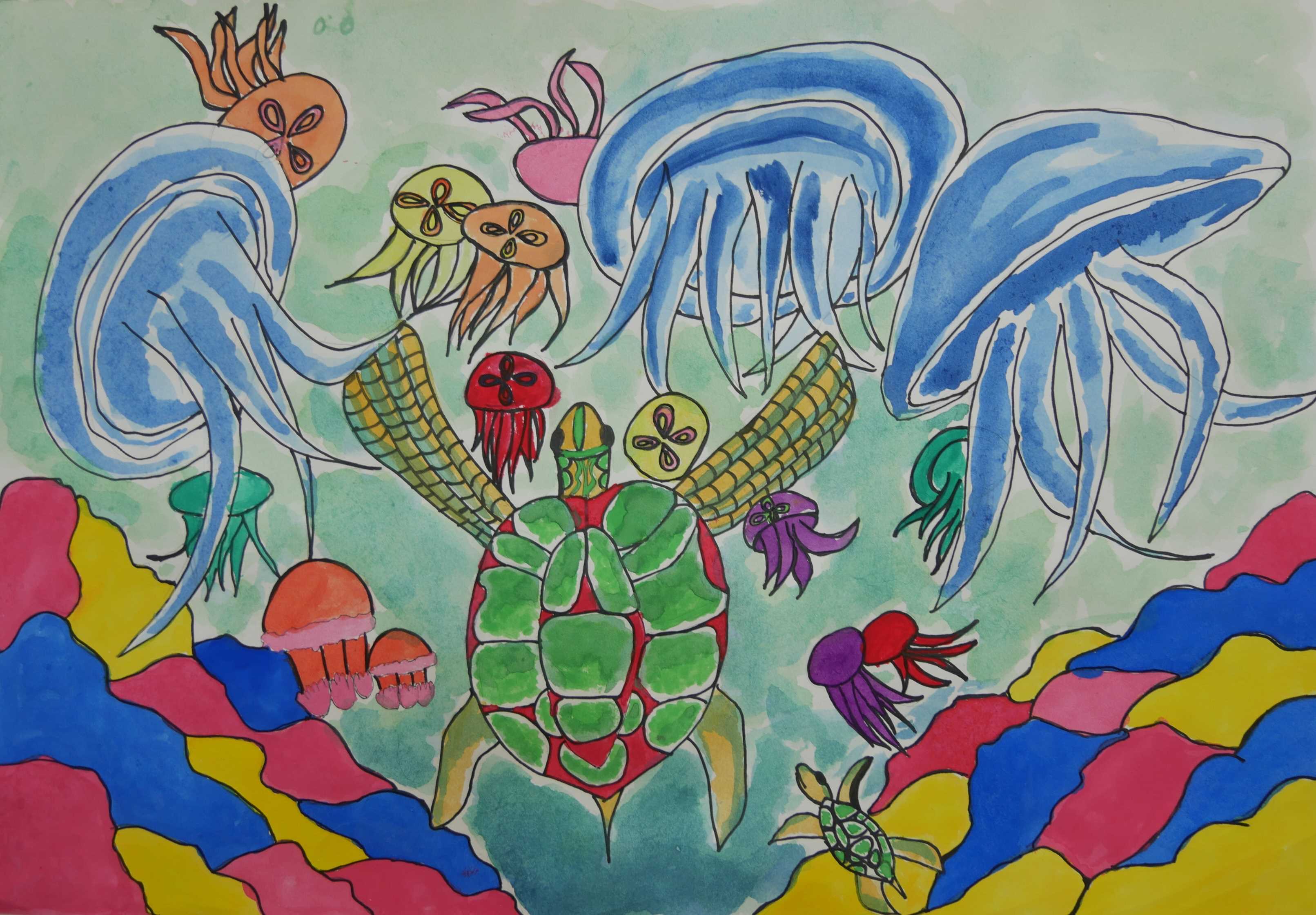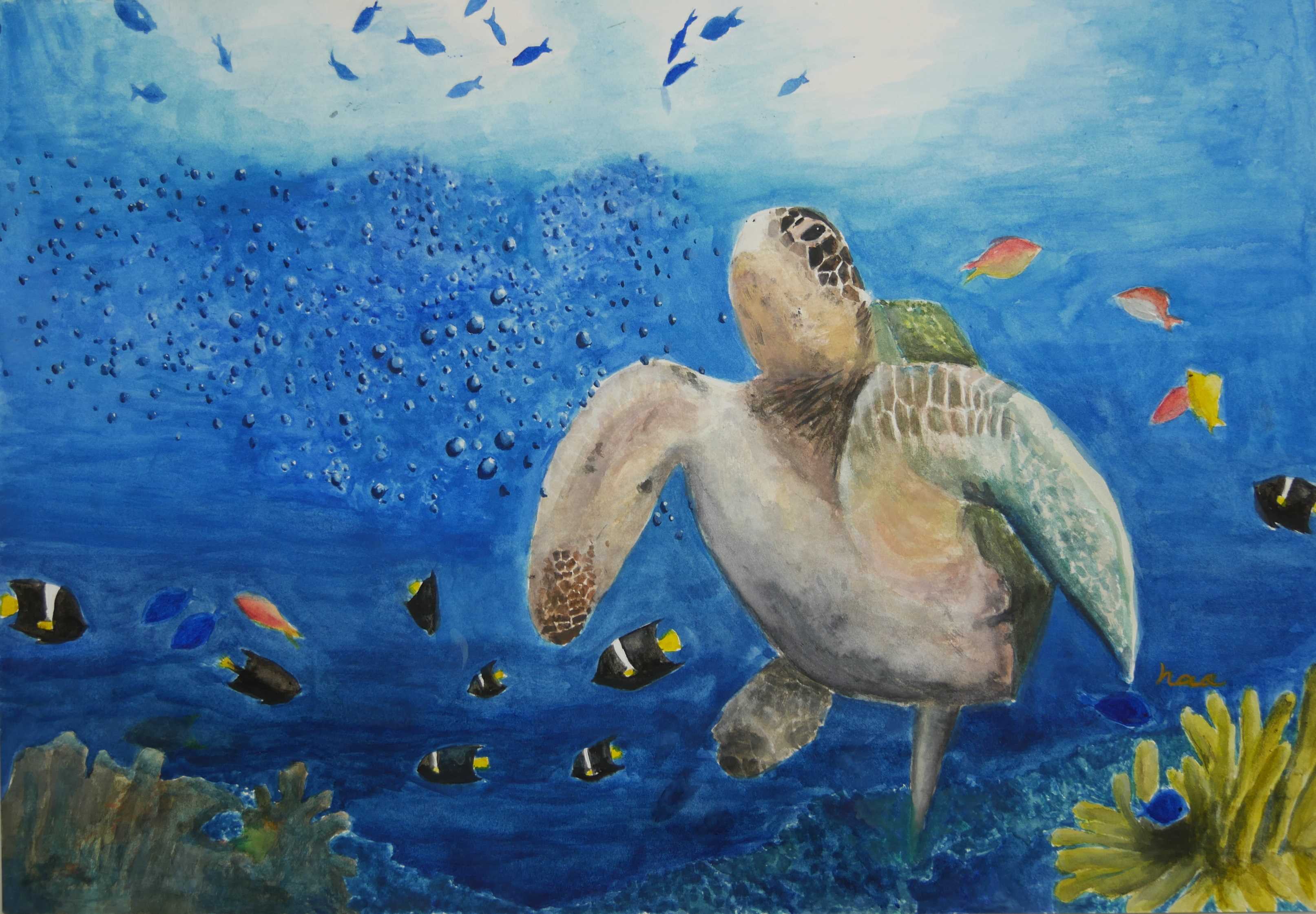 「海中の深さを色の濃度で表し、大きな海亀が浮上する様子が描かれている。水中の泡が上手に描かれている。配色もきれいである。」 |