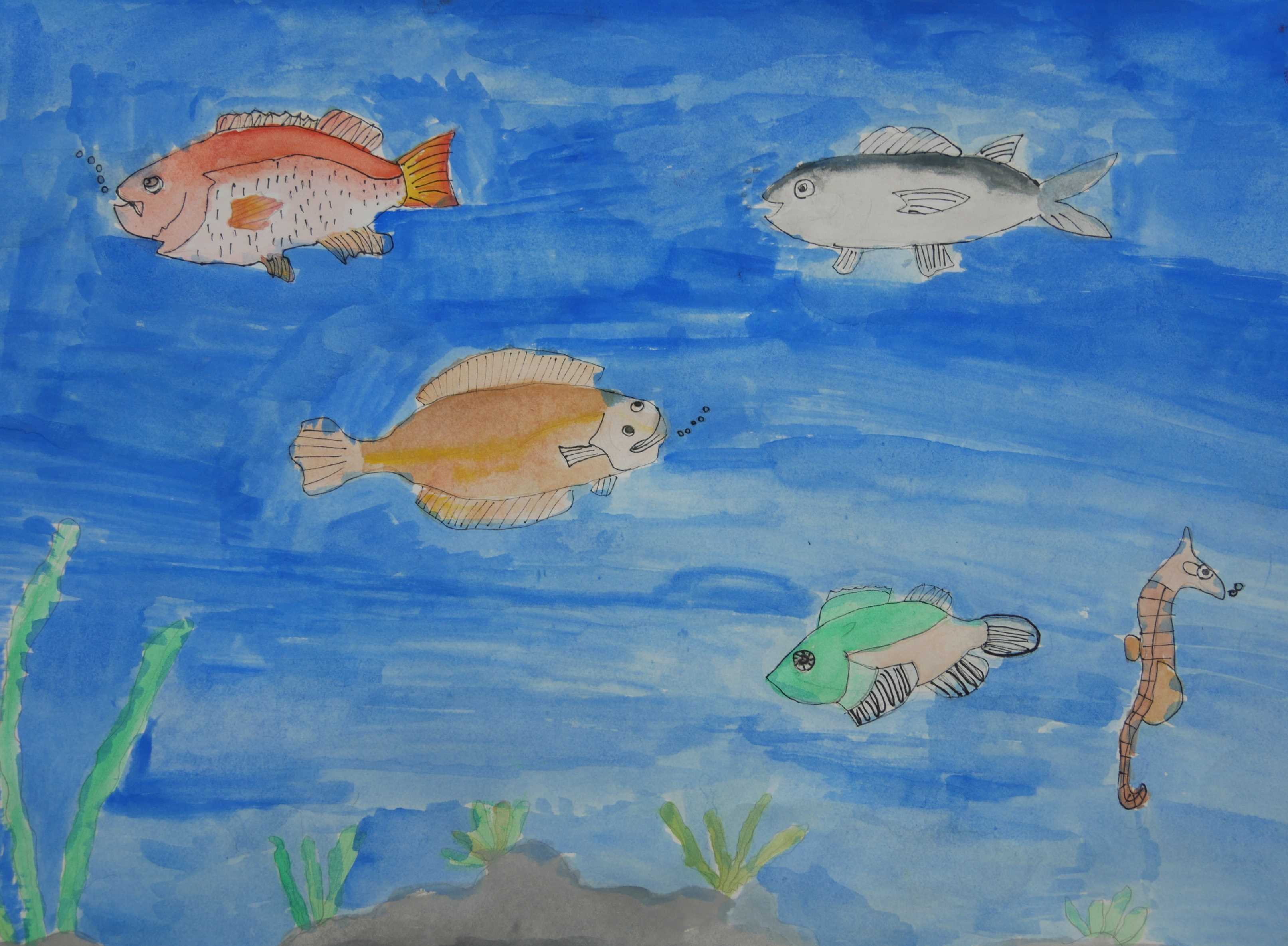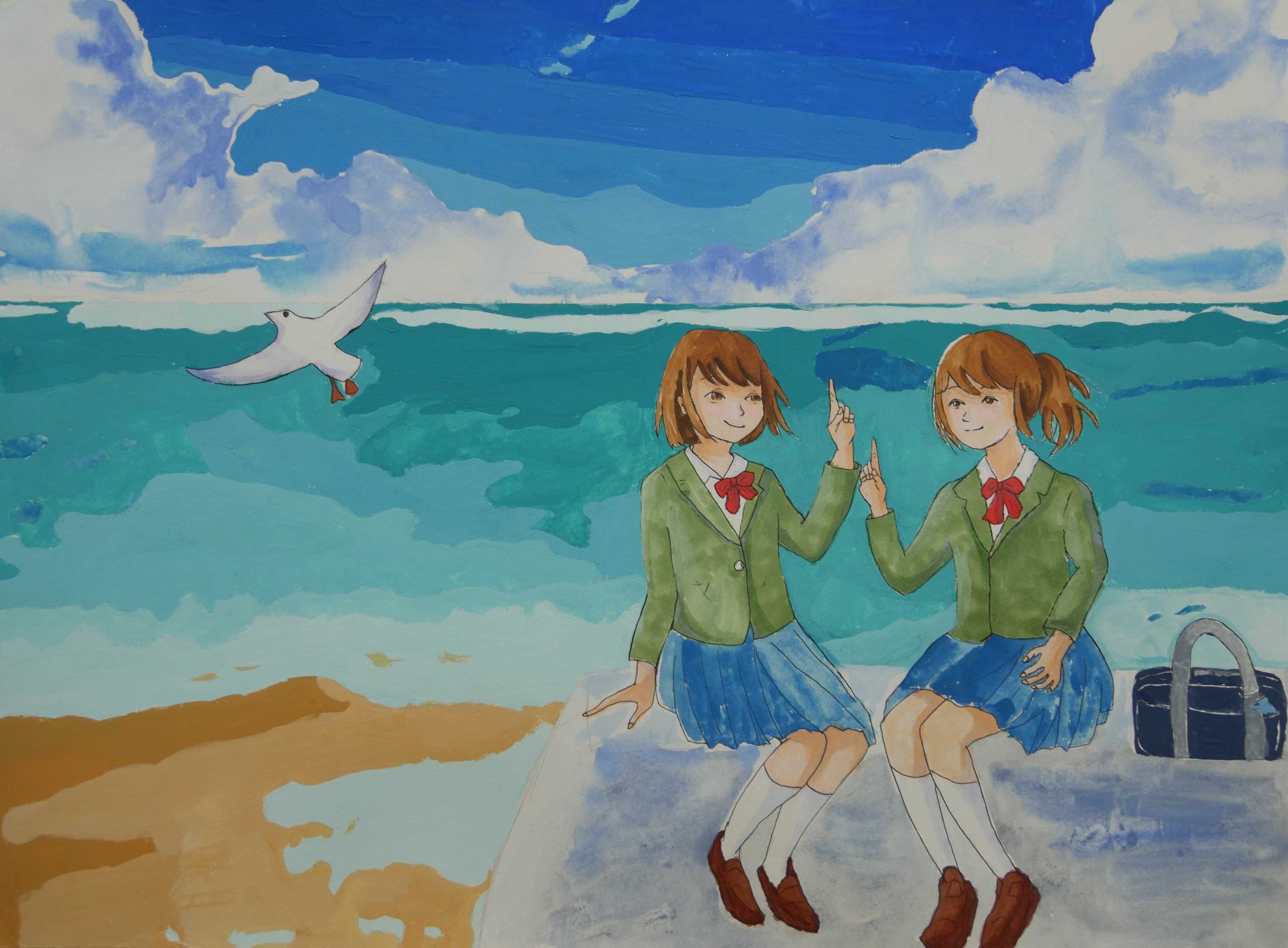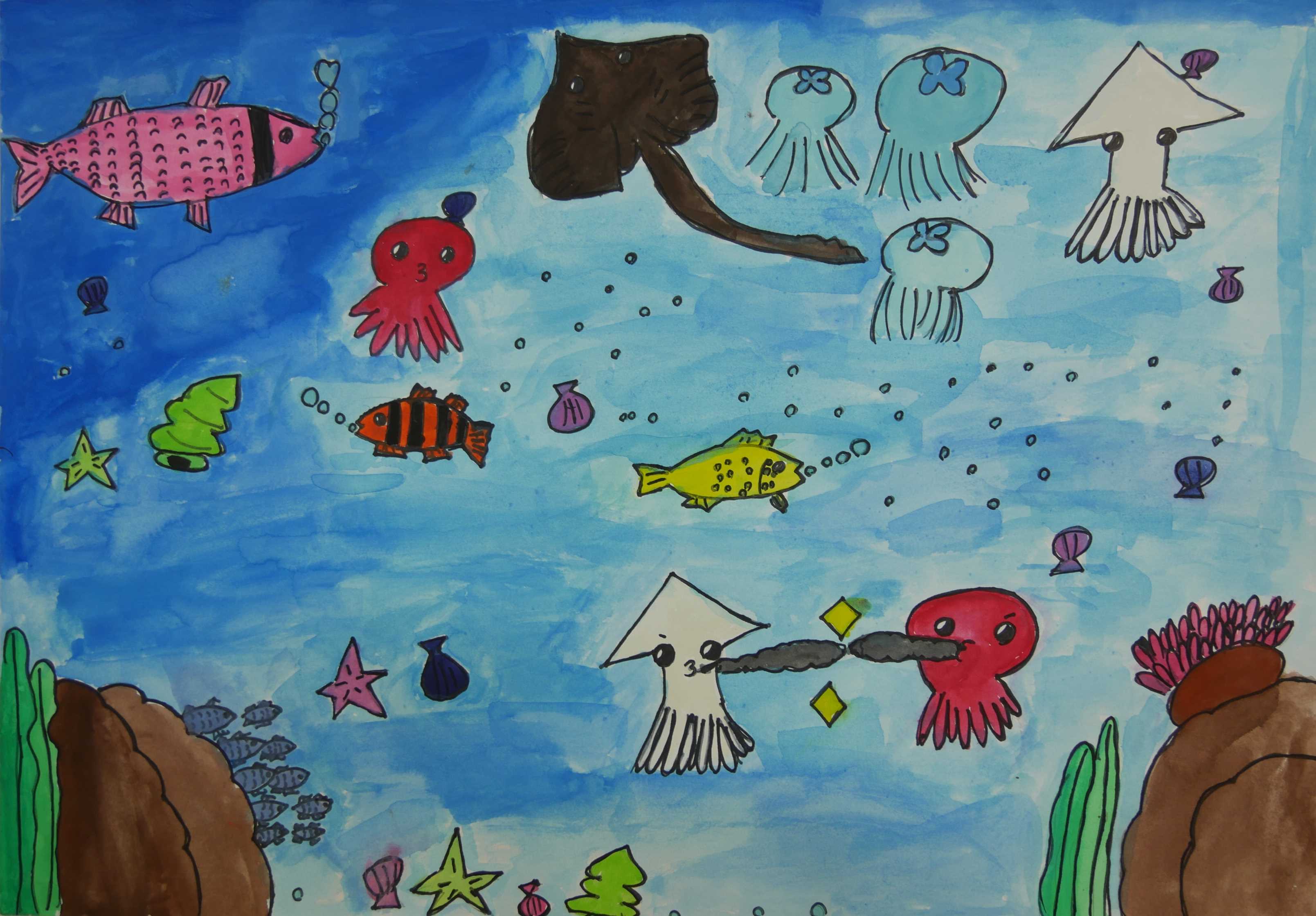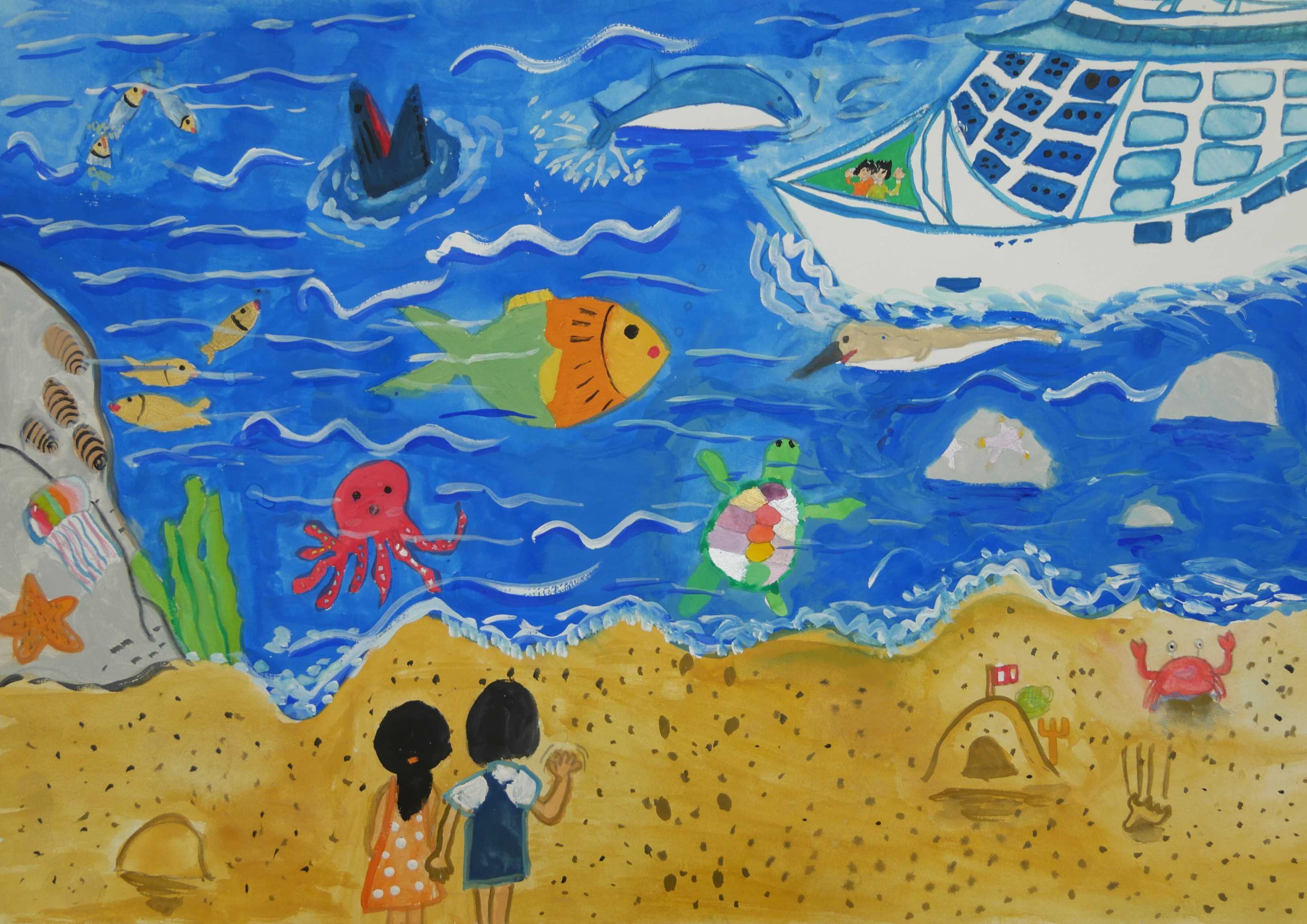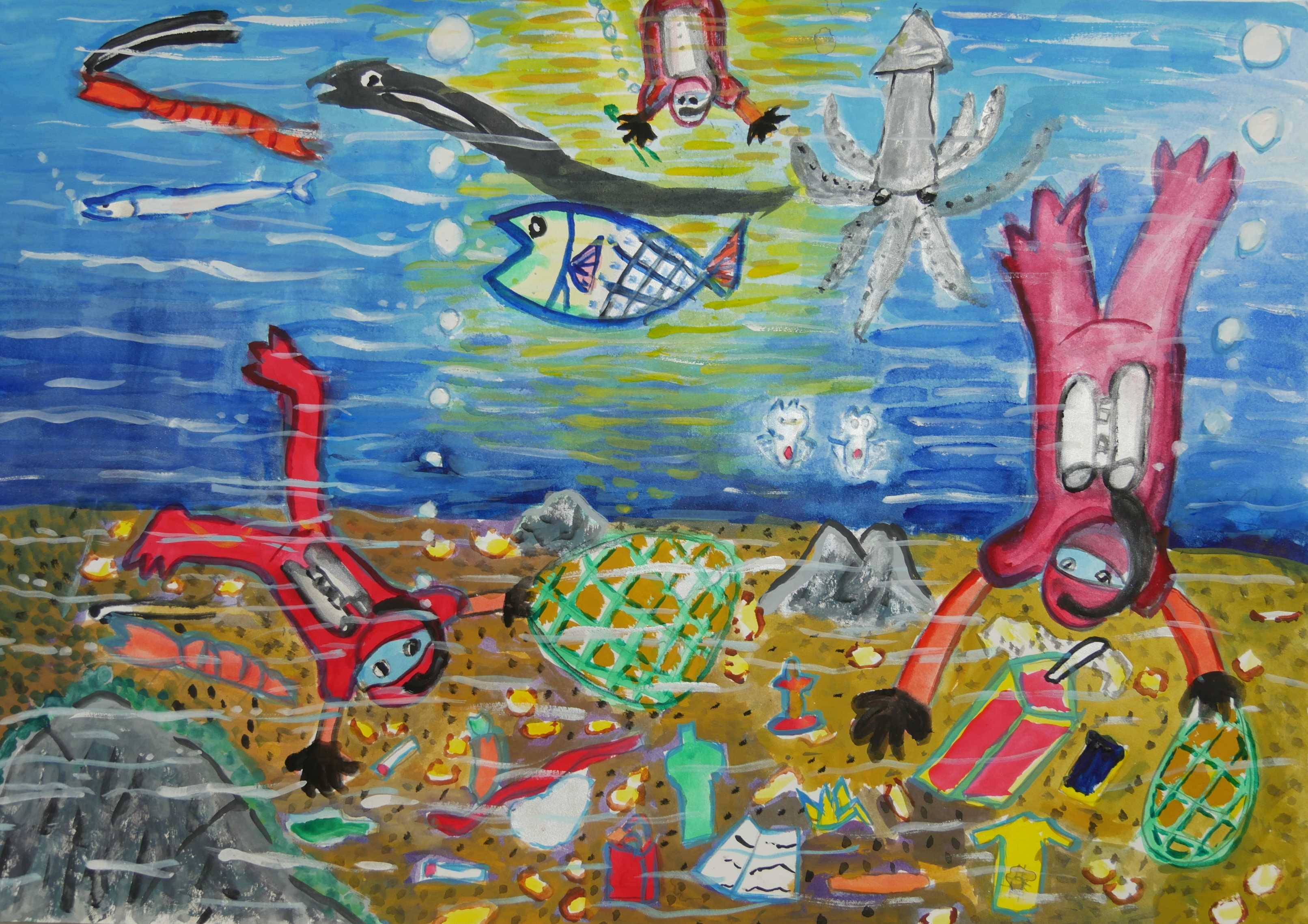 「海中の深さを色の濃度で表し、大きな海亀が浮上する様子が描かれている。水中の泡が上手に描かれている。配色もきれいである。」 |