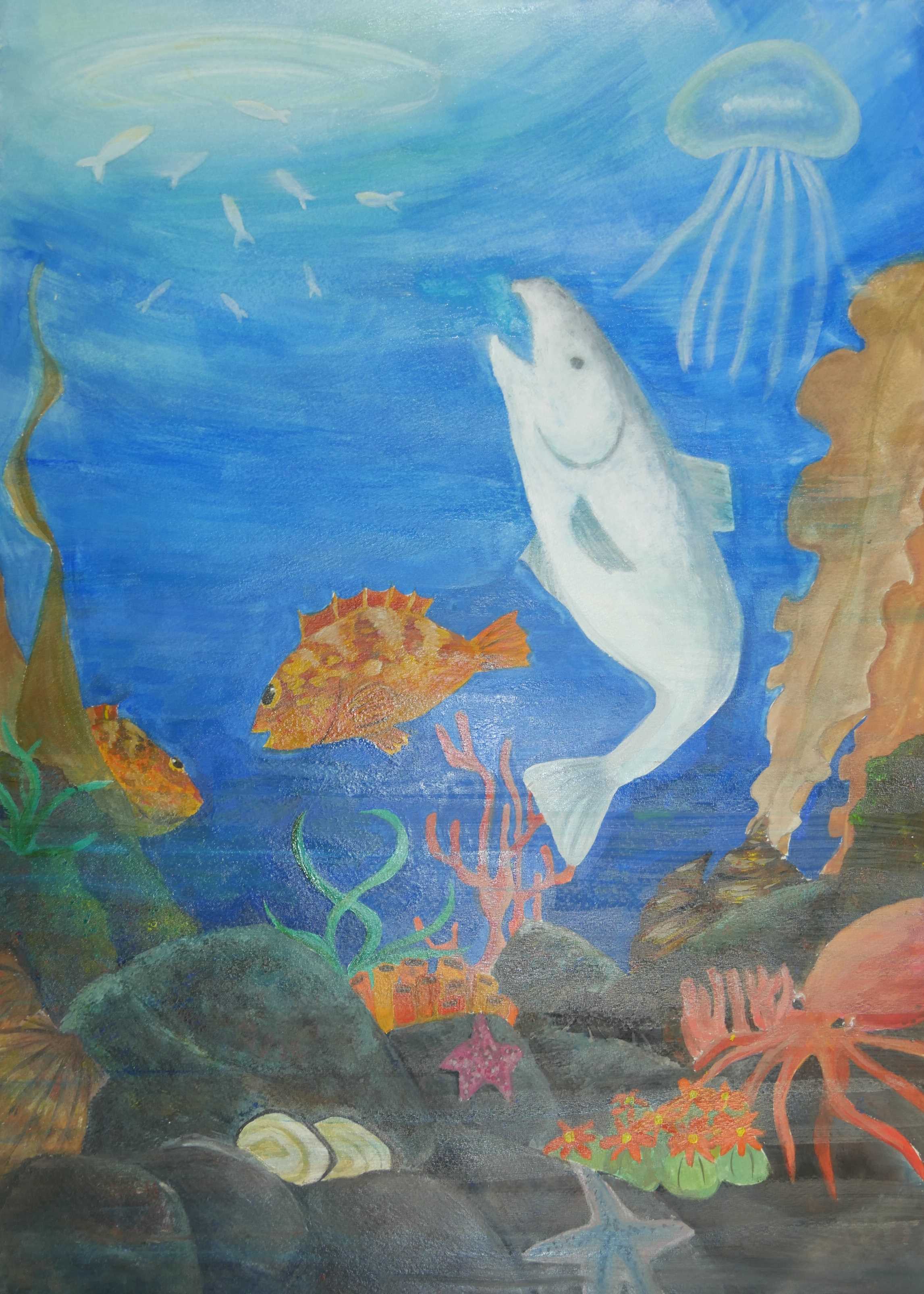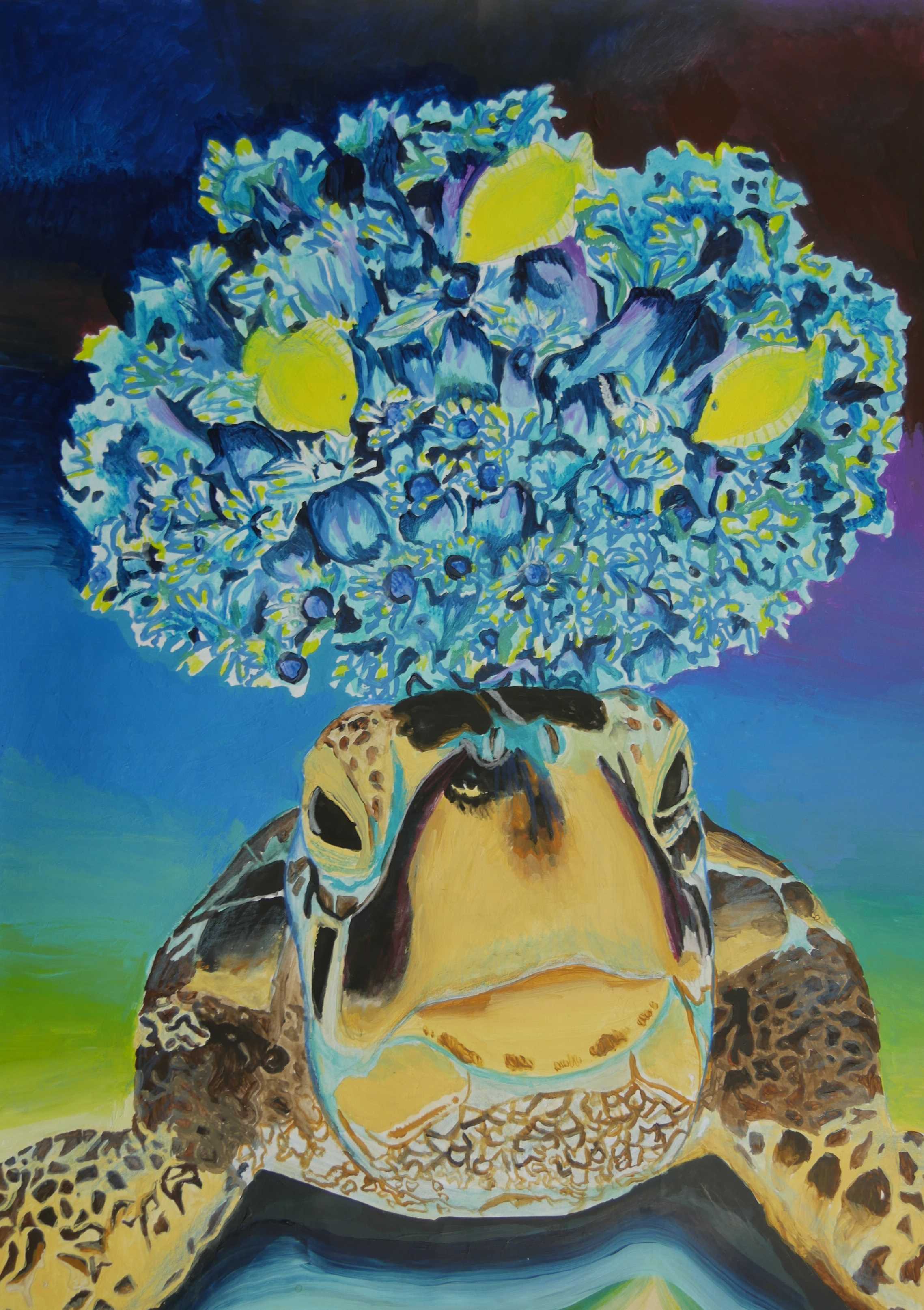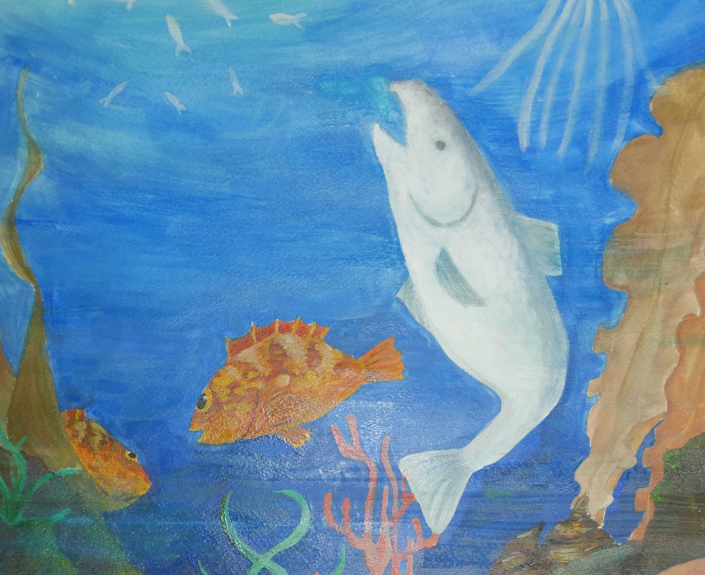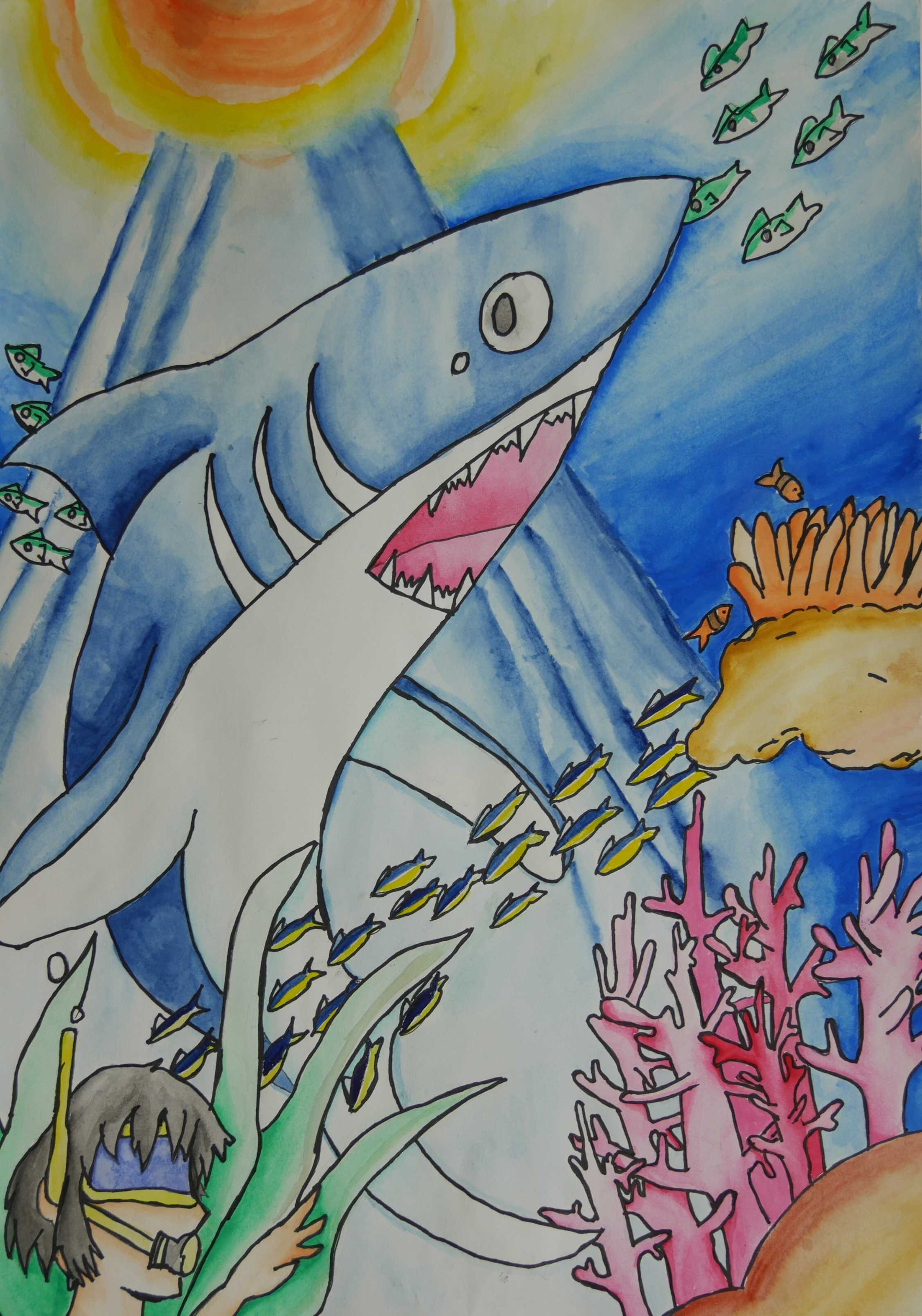 「海中の深さを色の濃度で表し、大きな海亀が浮上する様子が描かれている。水中の泡が上手に描かれている。配色もきれいである。」 |