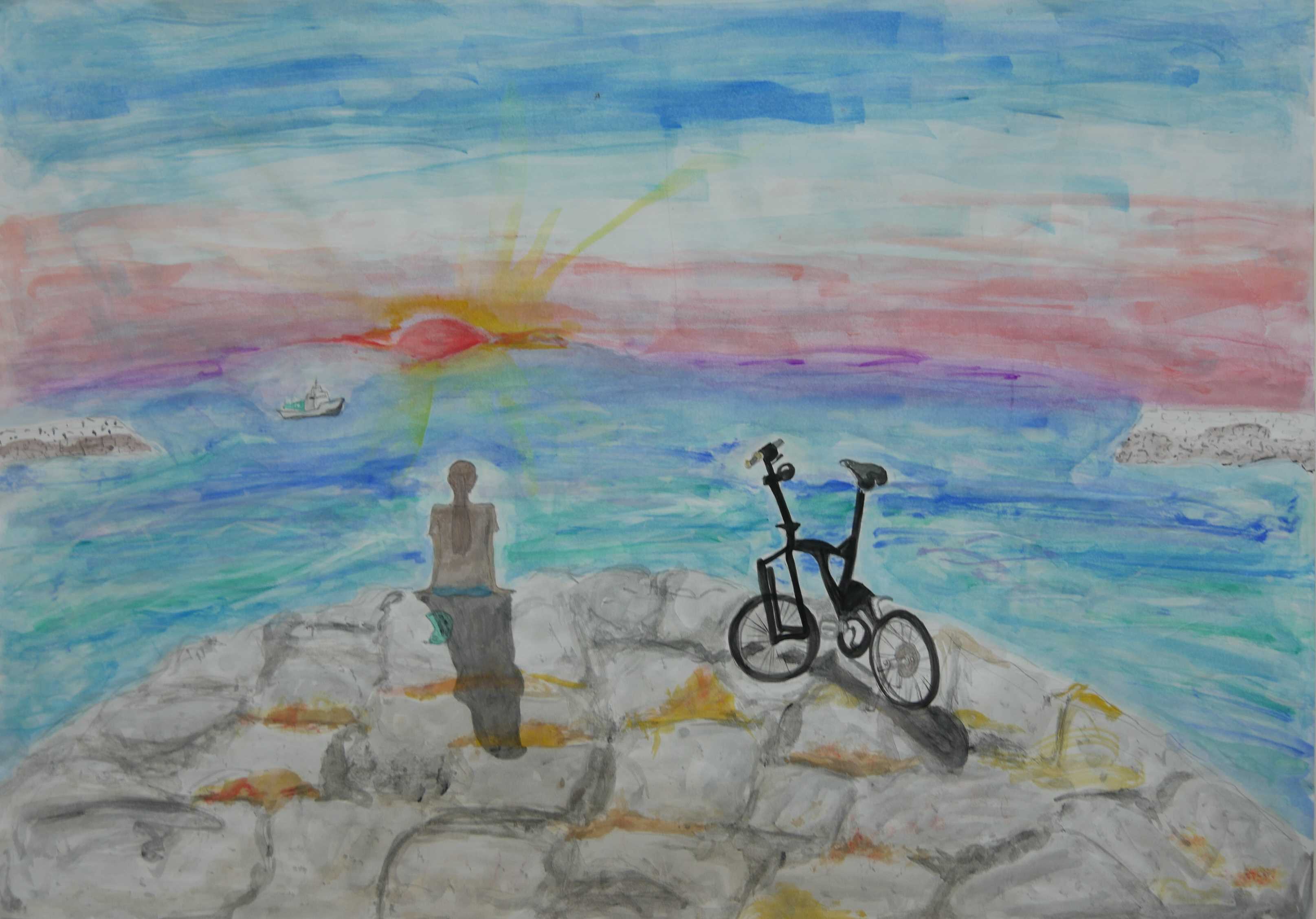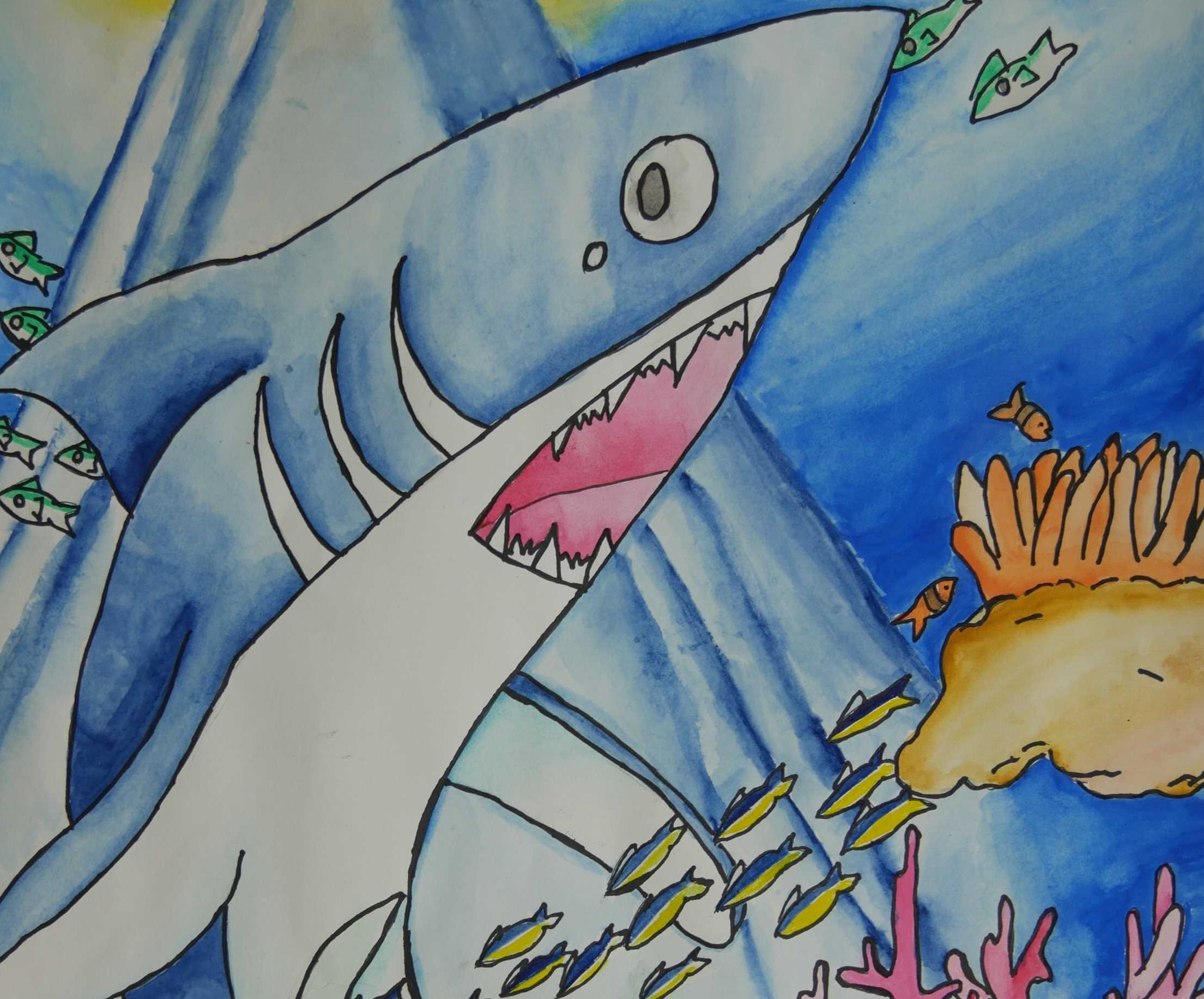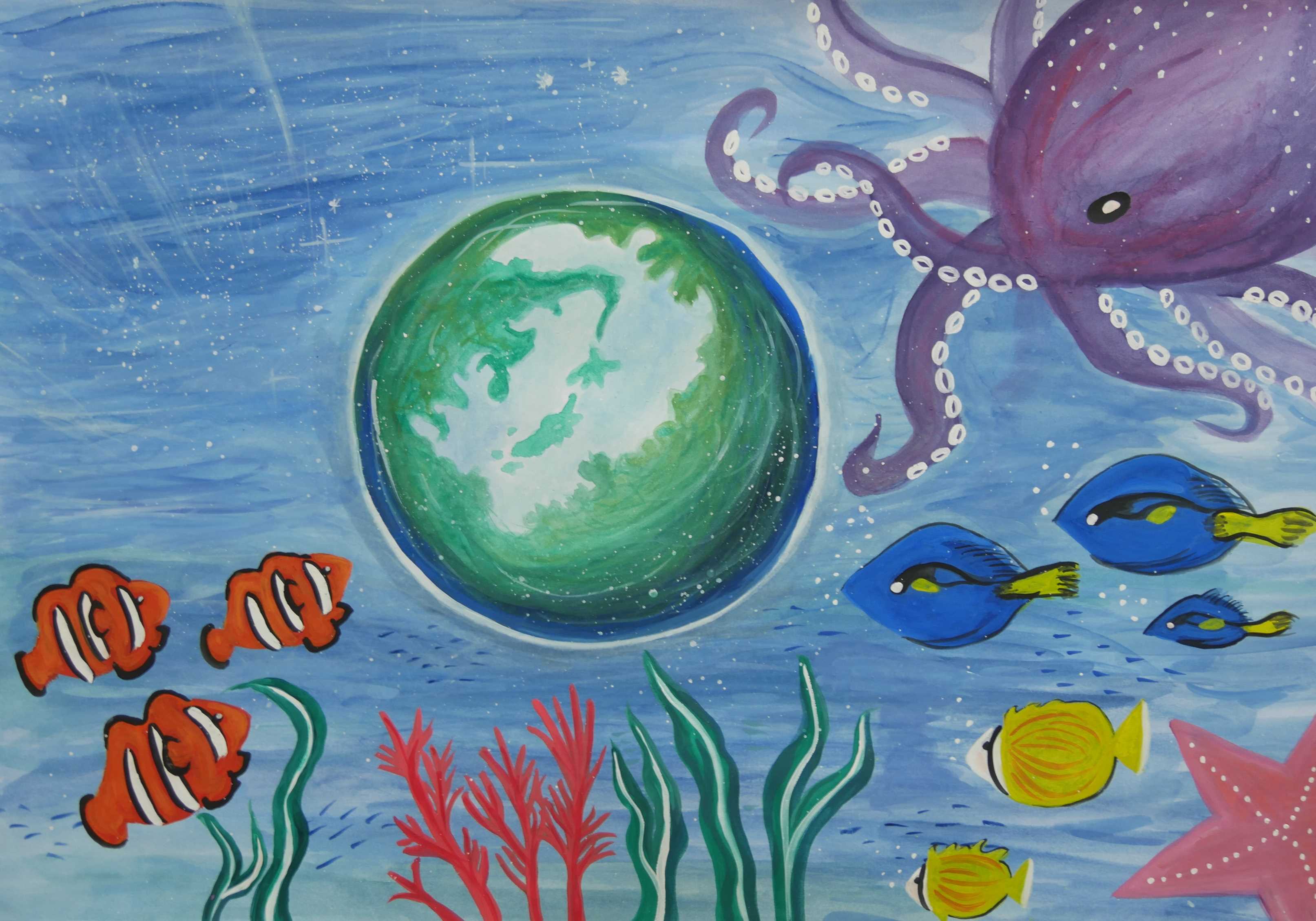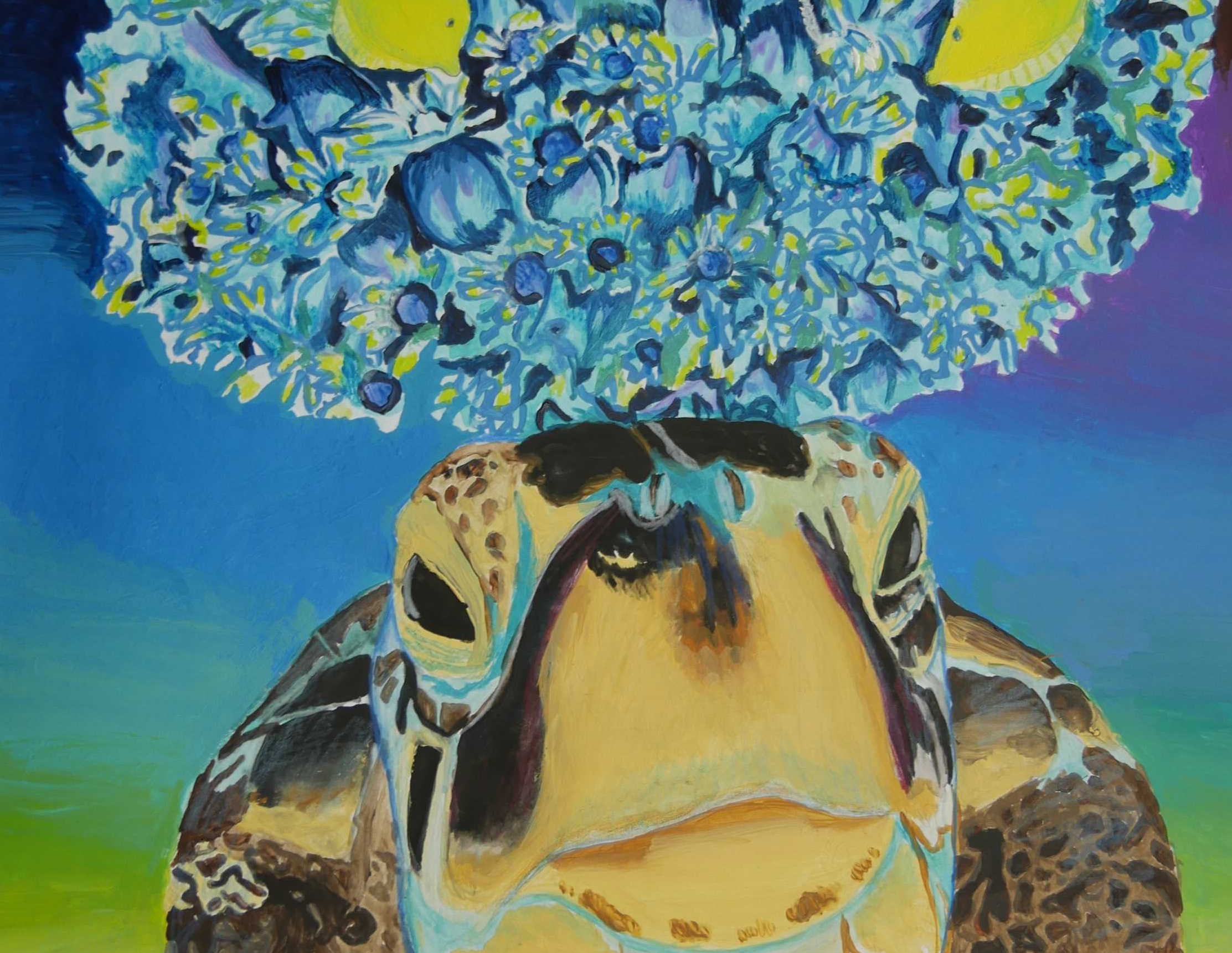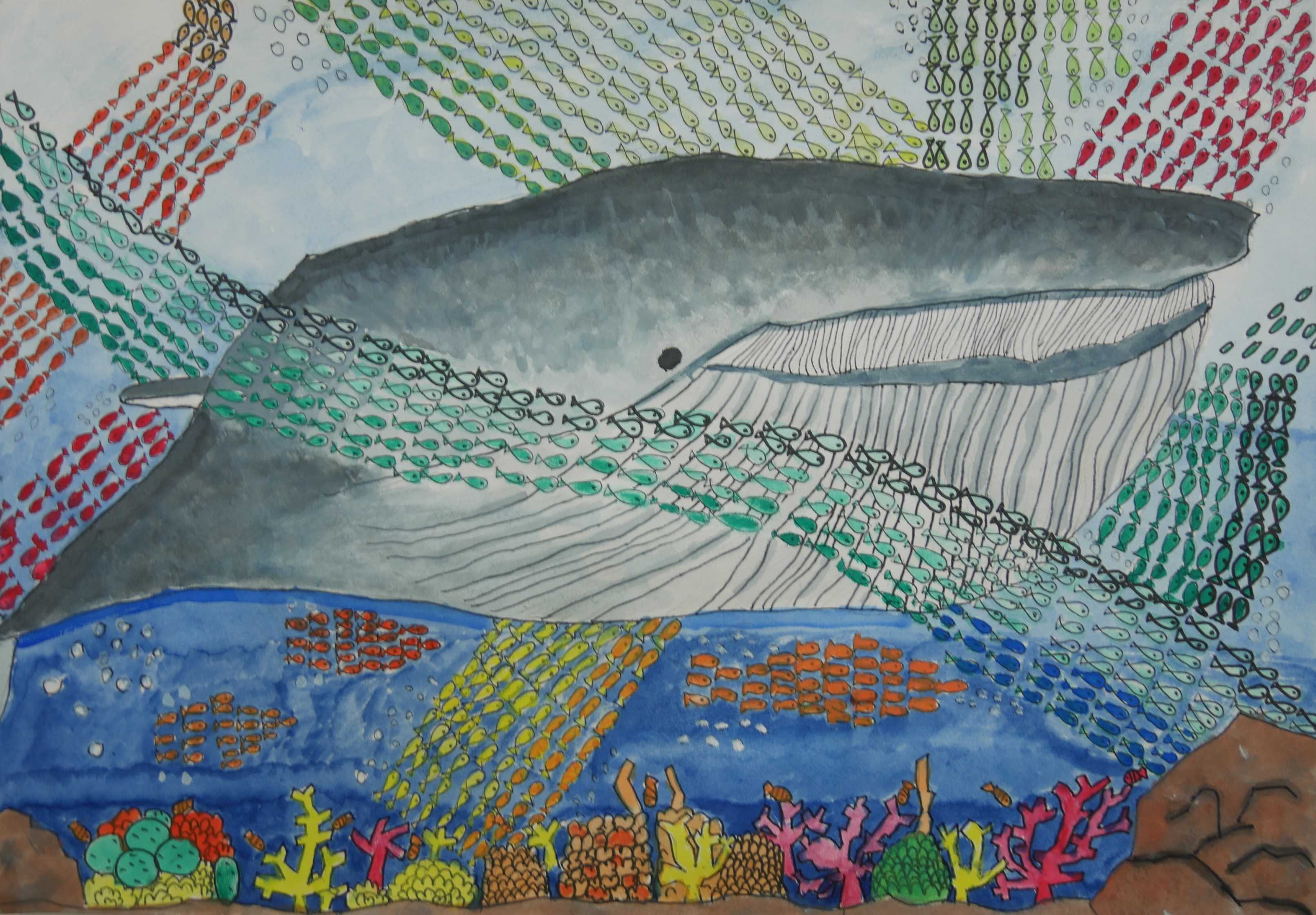 「海中の深さを色の濃度で表し、大きな海亀が浮上する様子が描かれている。水中の泡が上手に描かれている。配色もきれいである。」 |