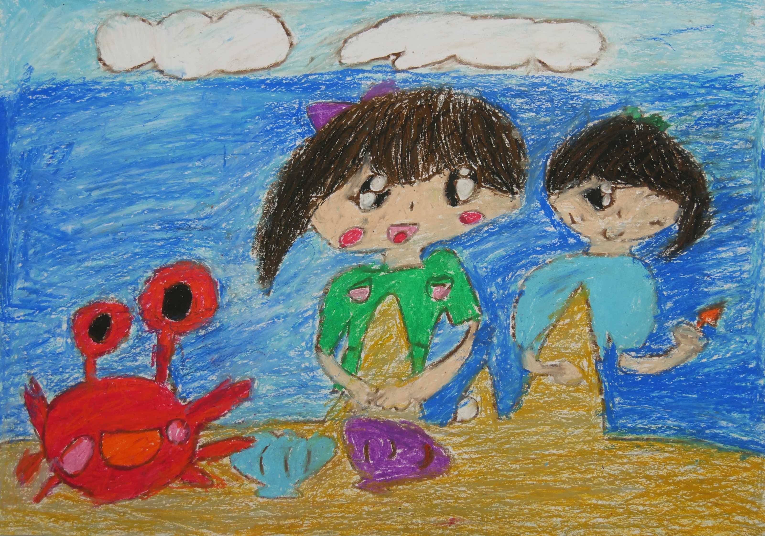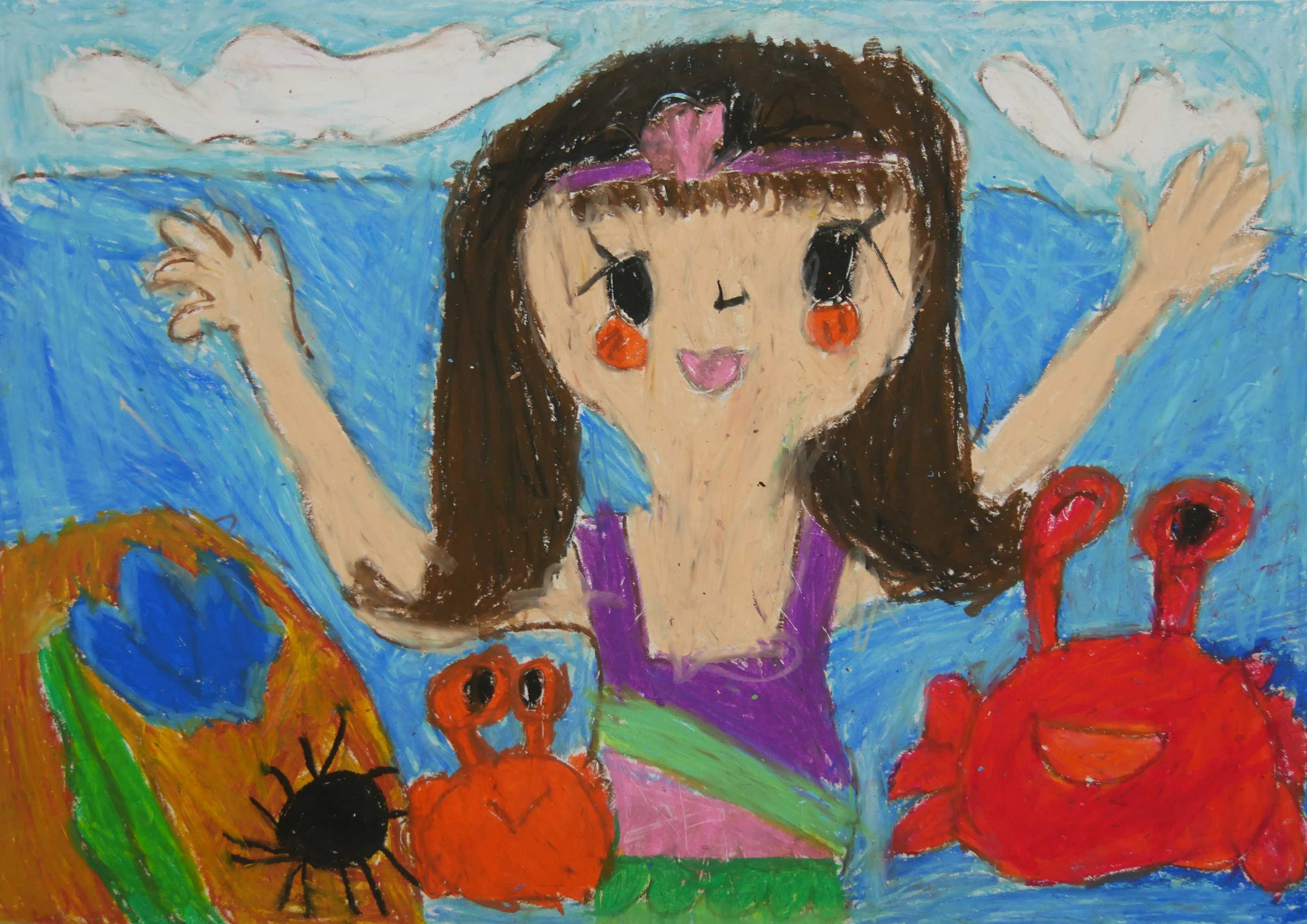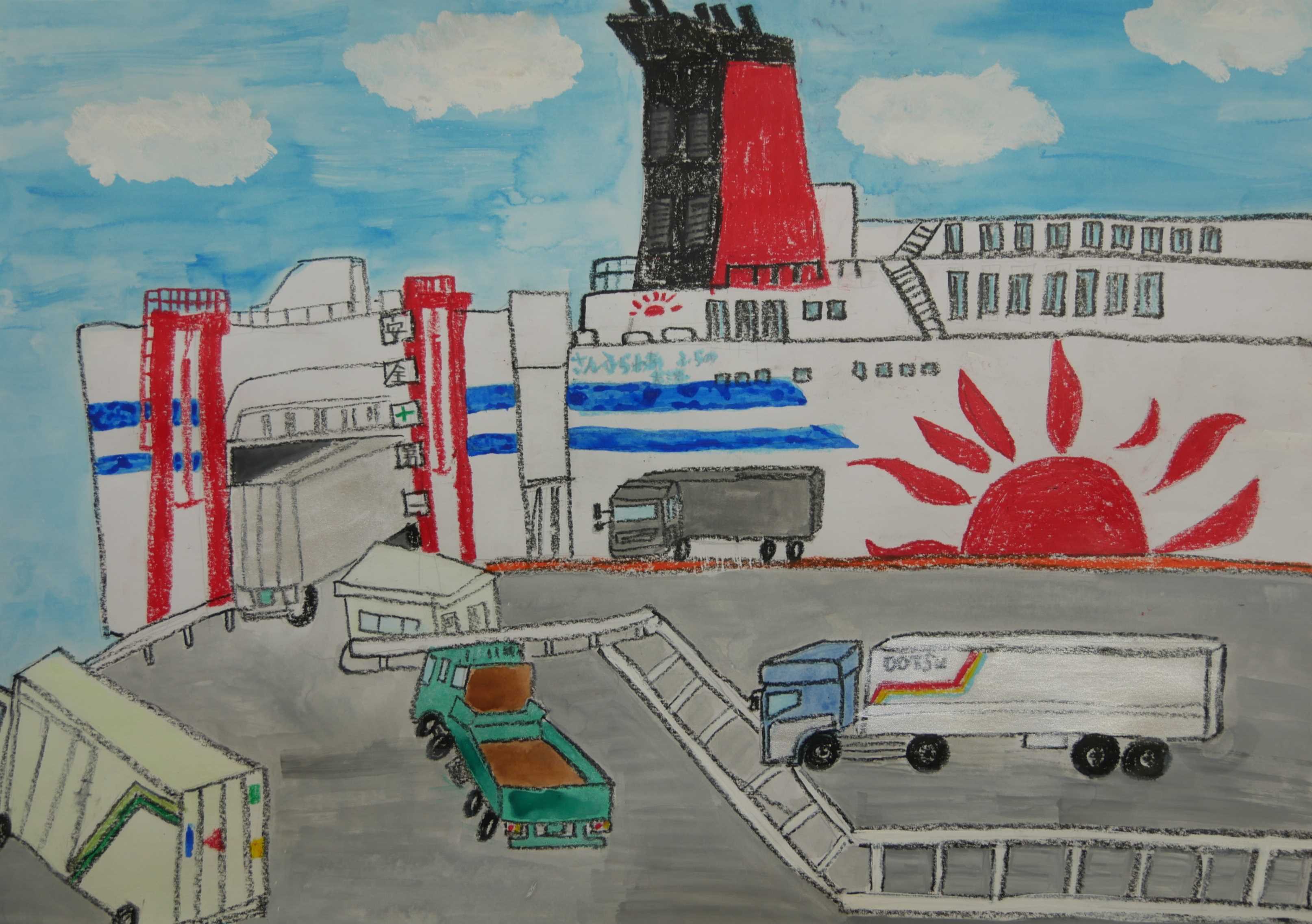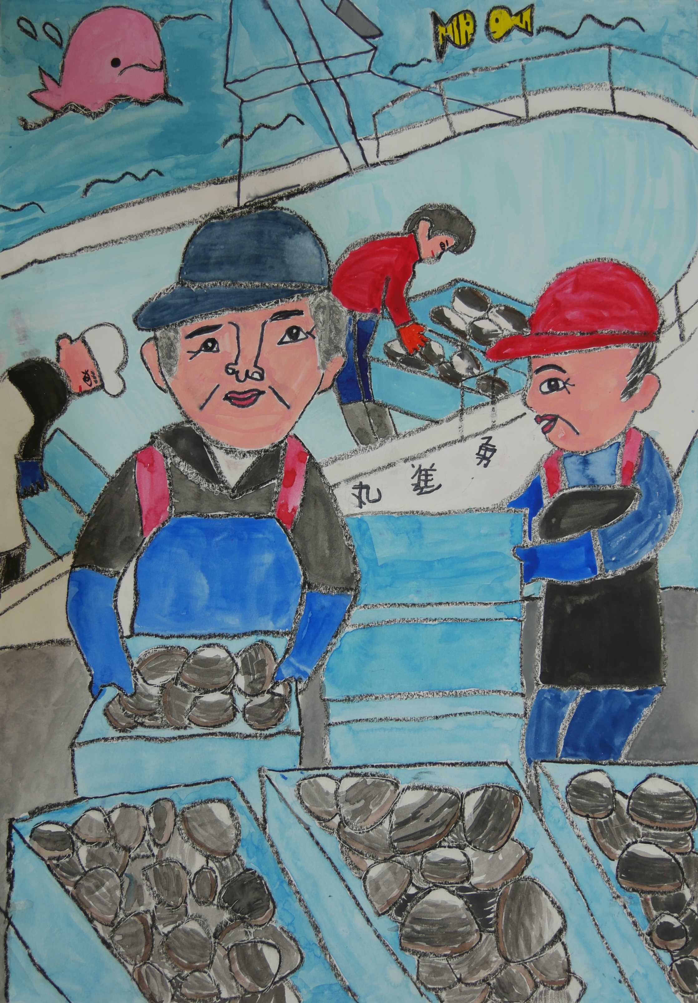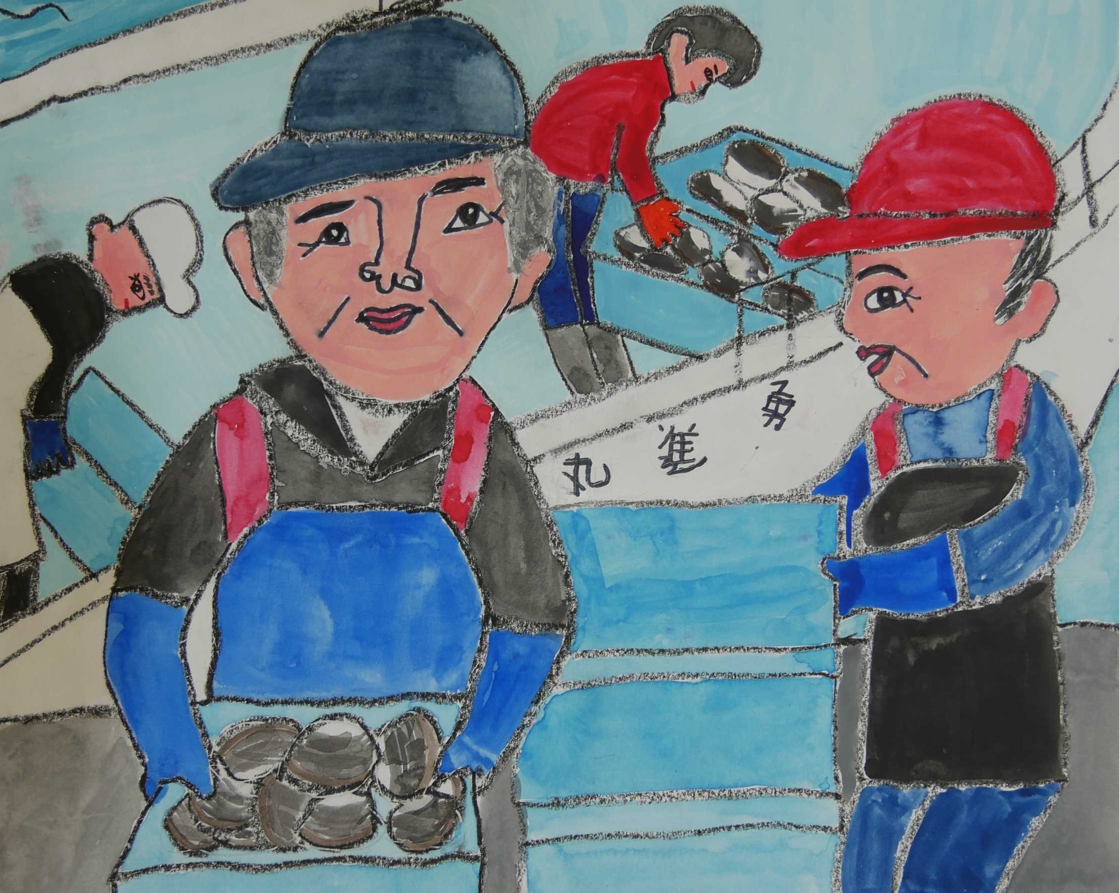 | ○特別審査員コメント 「漁業のおじいさんやおじさん達が一生懸命働いているところが良く描かれています。漁獲物のホッキ貝も上手に描けています。いつまでもたくさん獲れるキレイな海でありたいですね。」 |