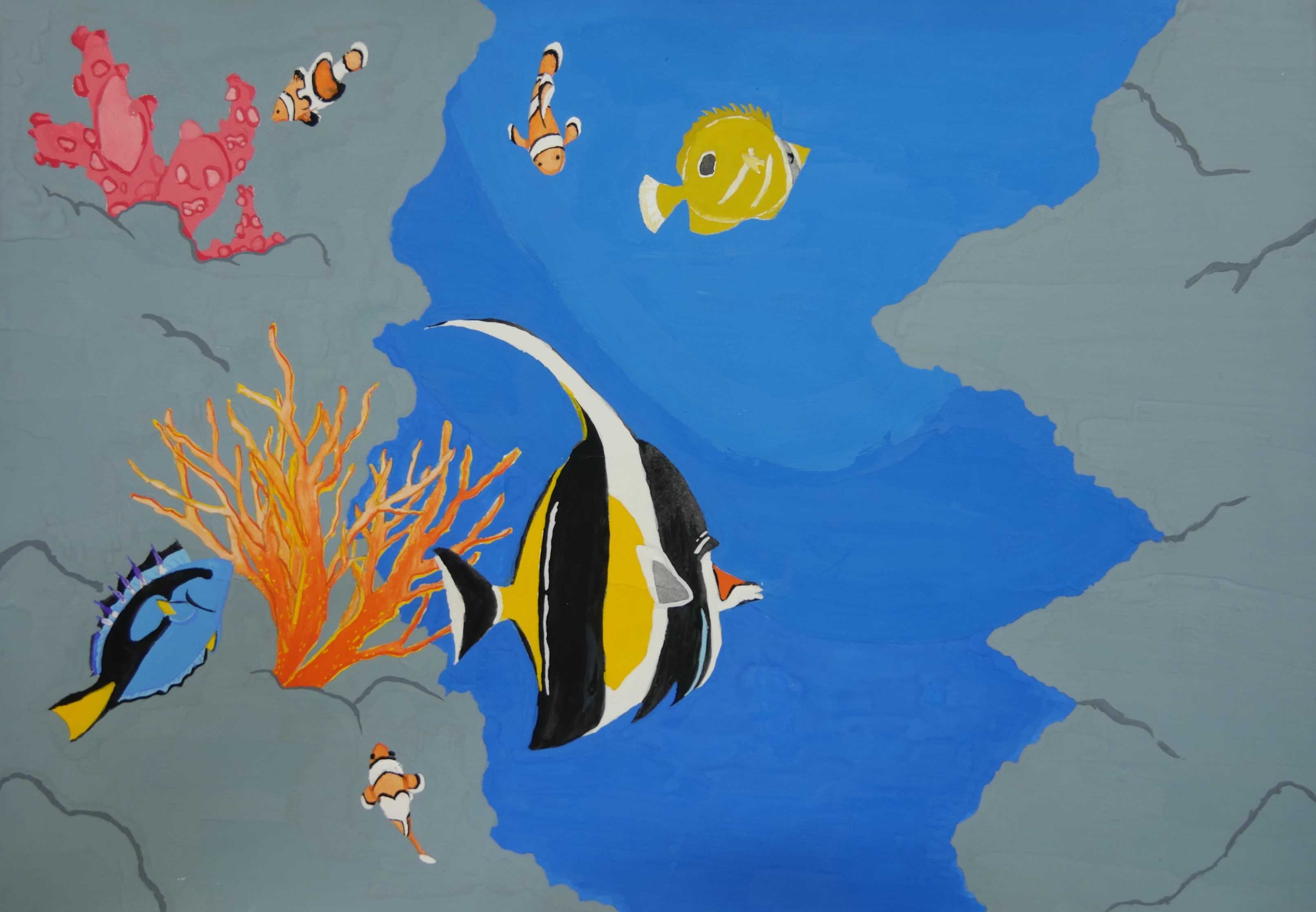 「たくさんの魚を画面一杯に交叉させ、色も美しく楽しい画です。」 |