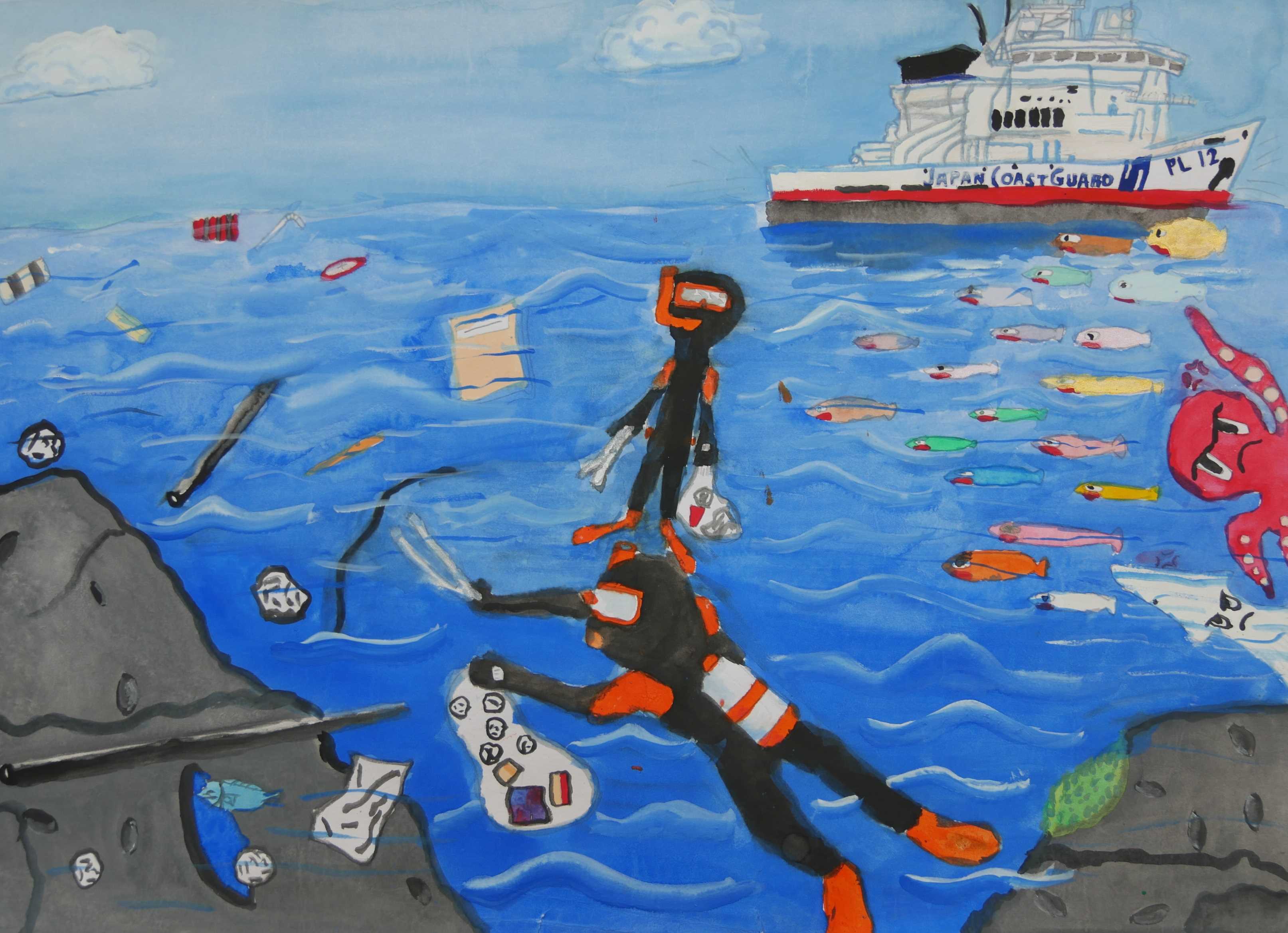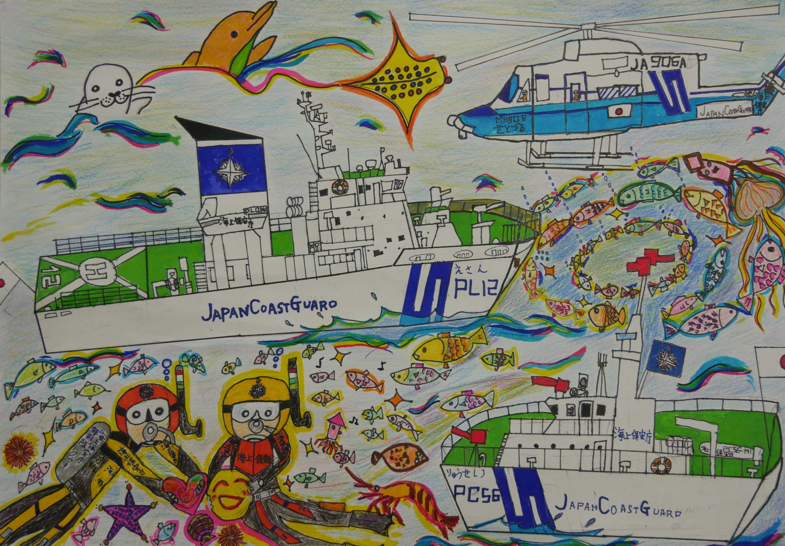 「海上保安庁と海に関するものが「これでもか」という程描かれています。手前のダイバーが命と笑顔を担っています。作者の強い想いが伝わってきます。」 |