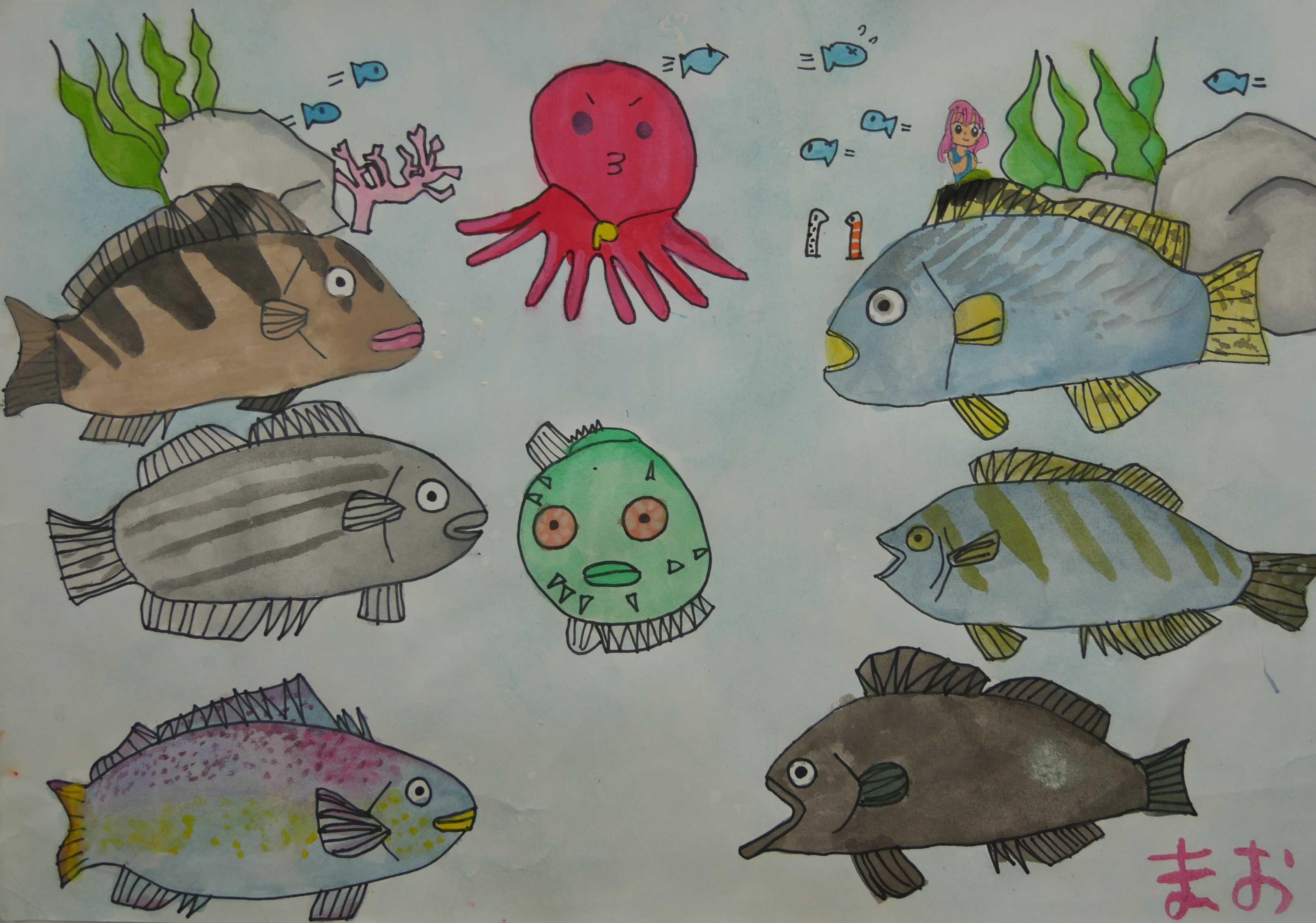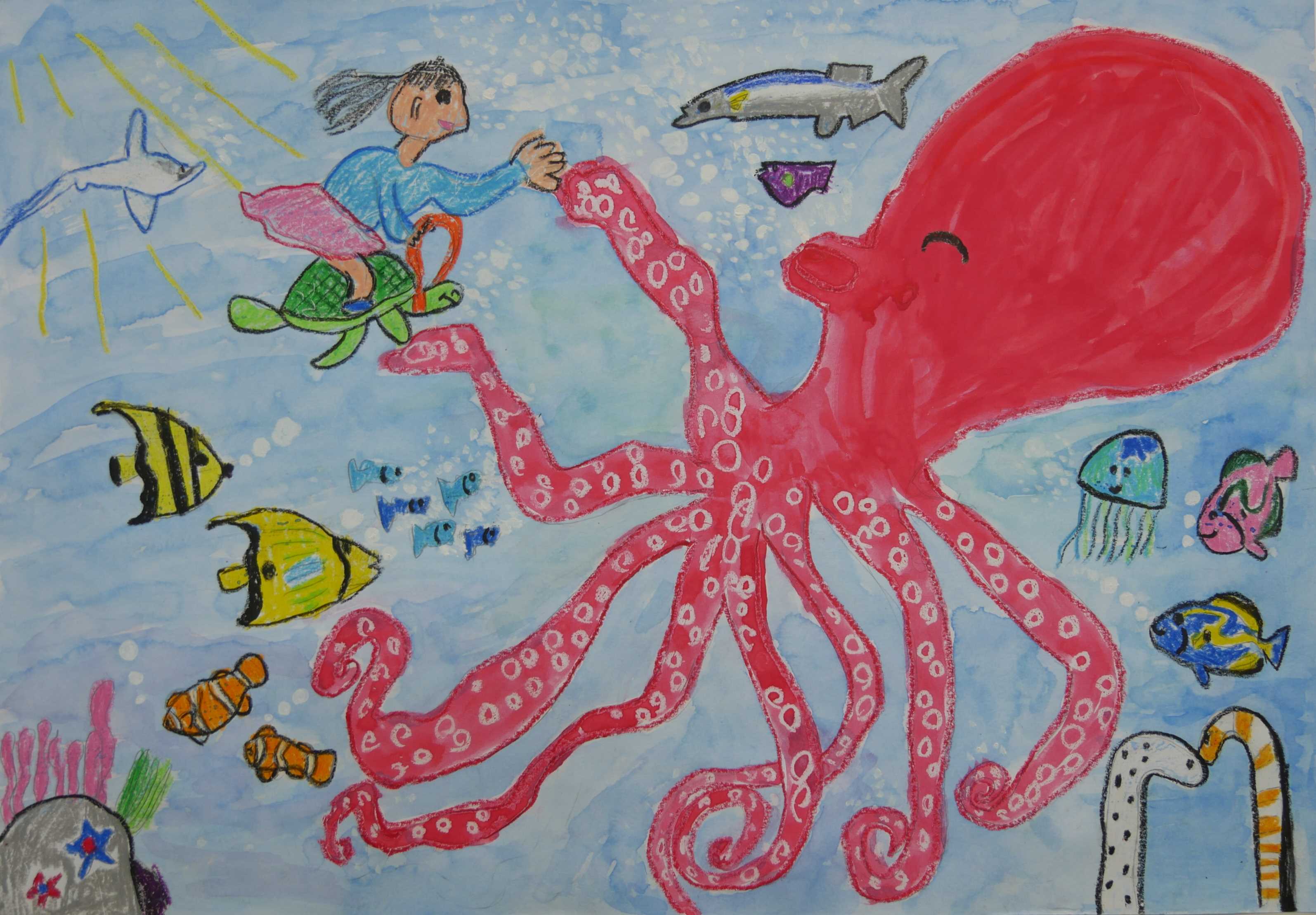 「タコが大胆に描かれています。カメに乗った女の子(作者?)がタコと握手しています。一つ一つの生き物が、それぞれちゃんと生きて何かをしています。」 |