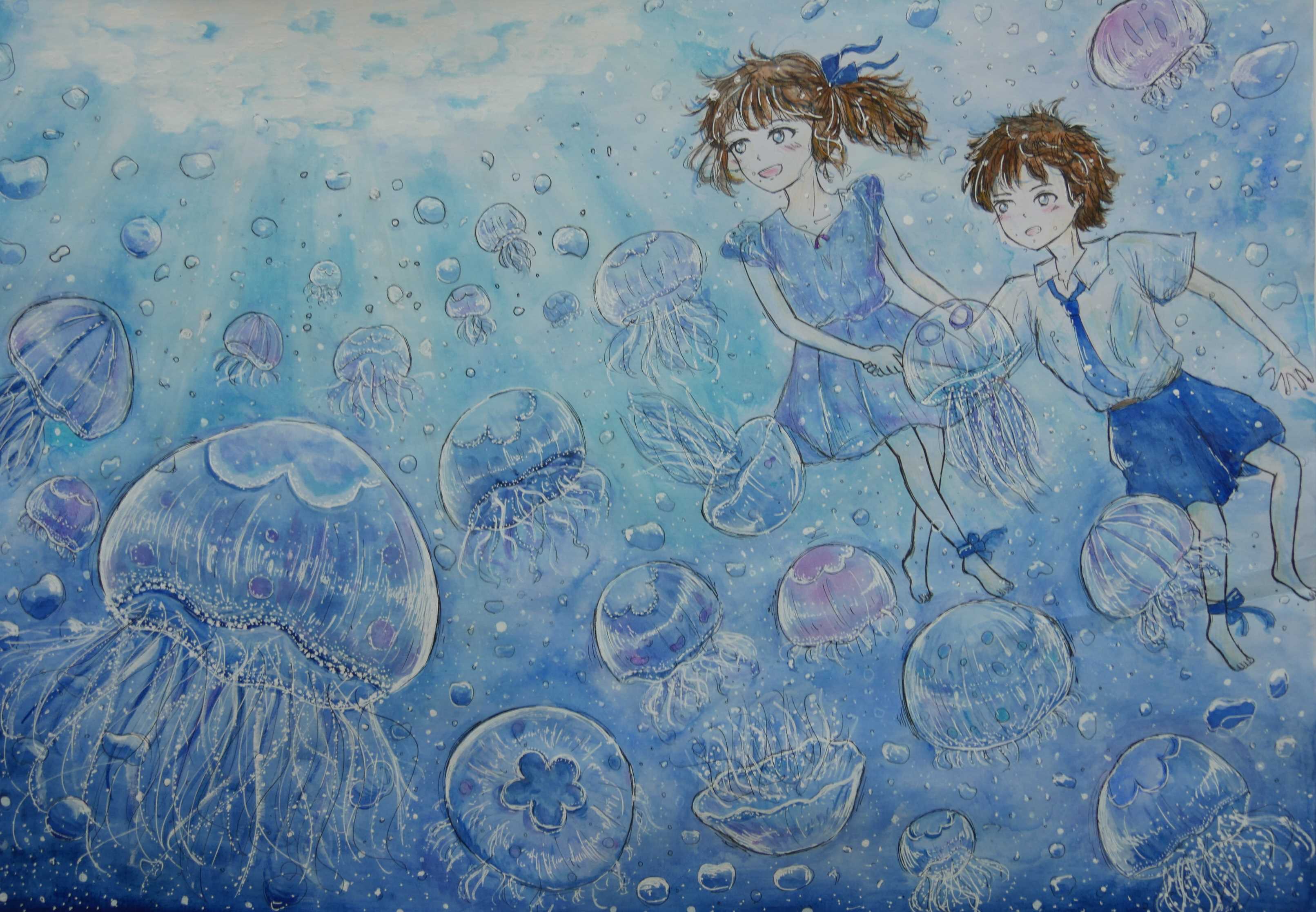 「クラゲの大量発生と聞くと多くの大人は、マイナスのイメージを持つのですが、作者は透明で光を反射する美しく幻想的イメージを膨らませています。とれもキレイなイメージです。」 |