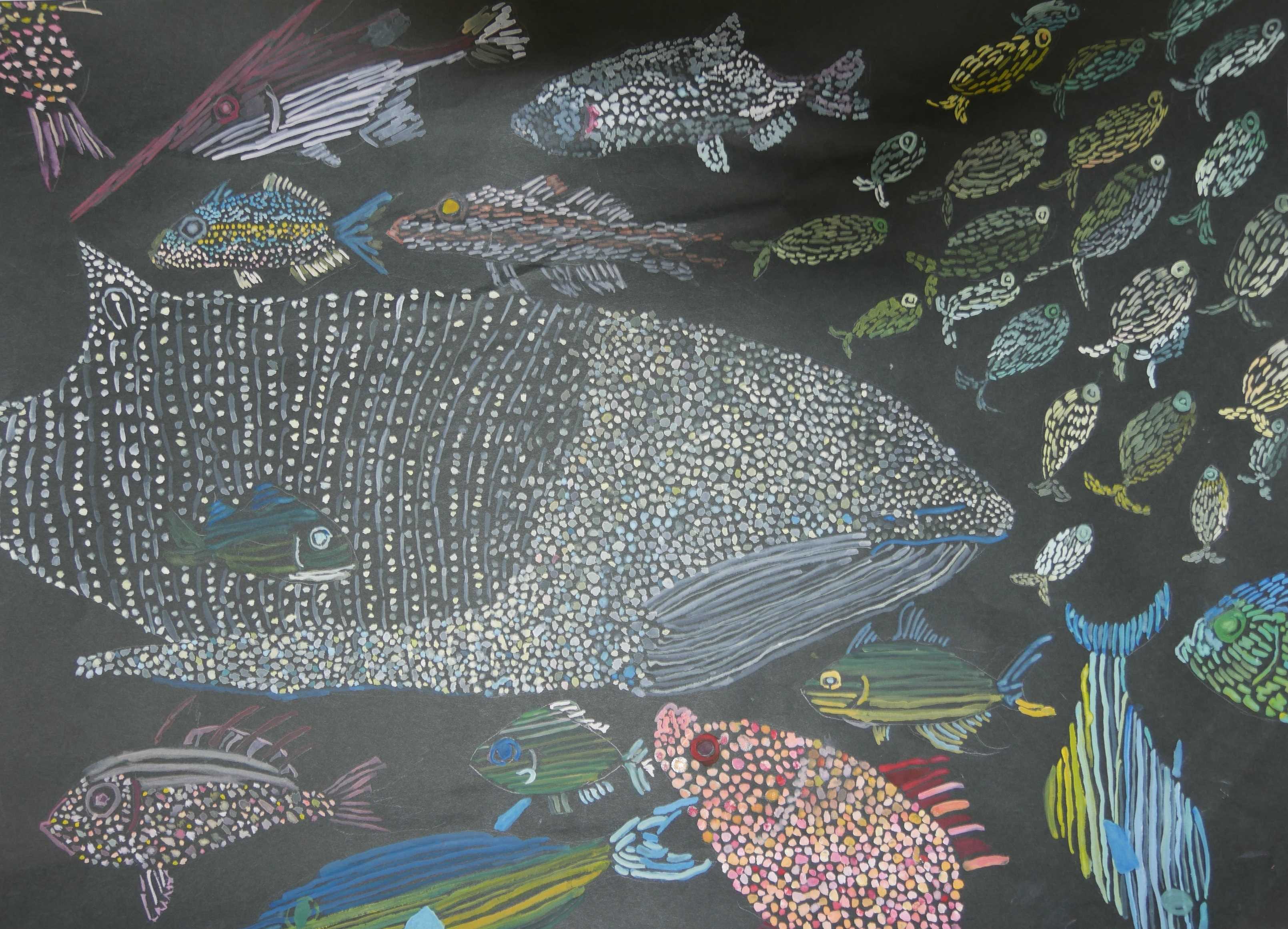 「黒色の台紙を使い点描で魚類を描いた珍しい手法です。深い海の中が想像されます。」 |