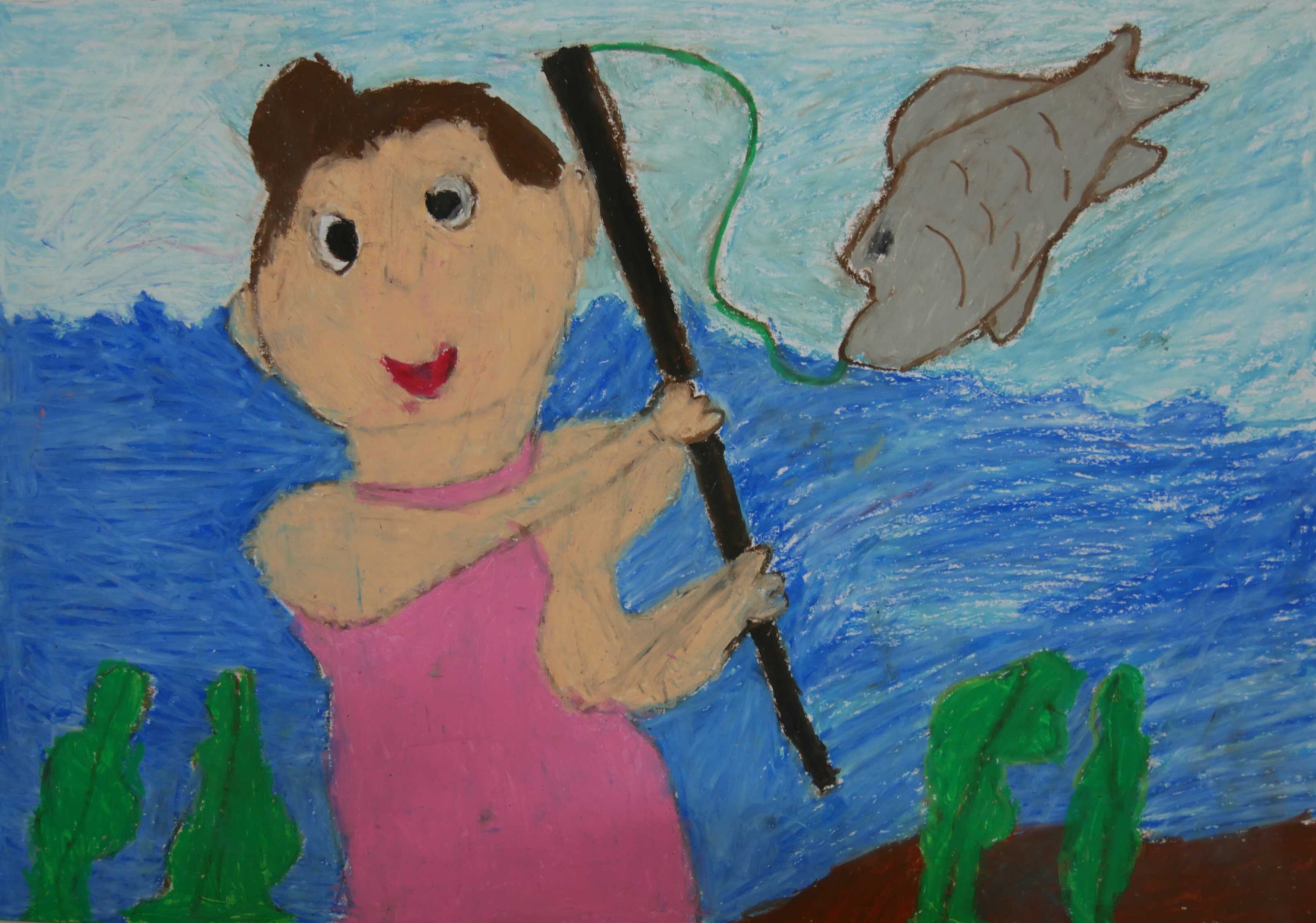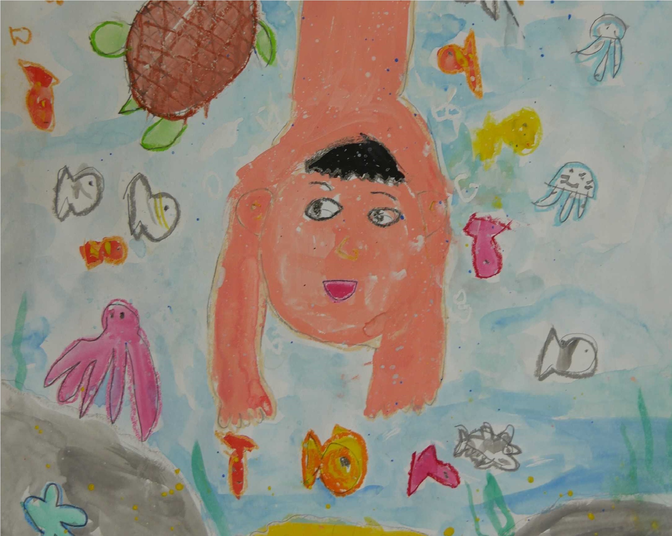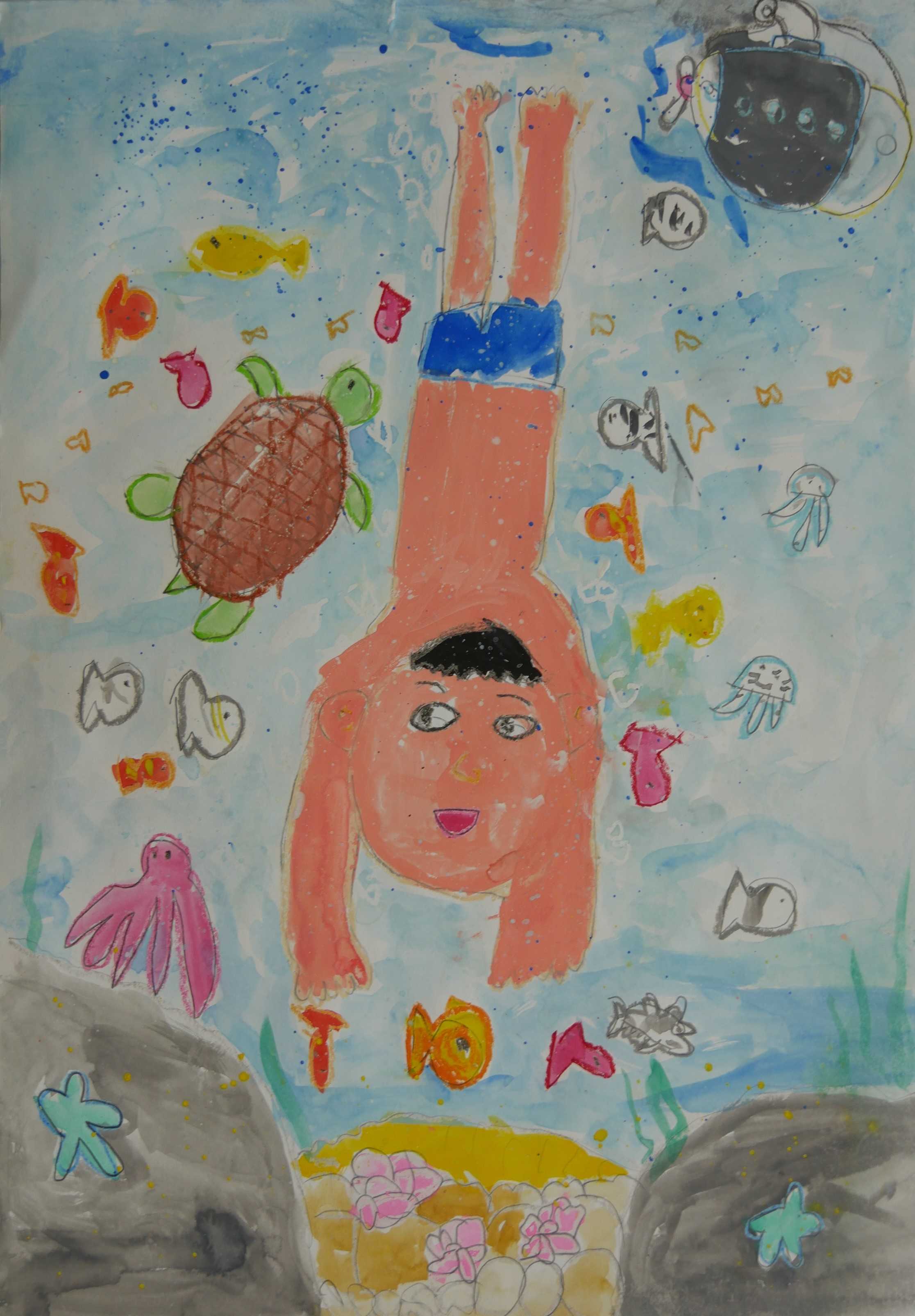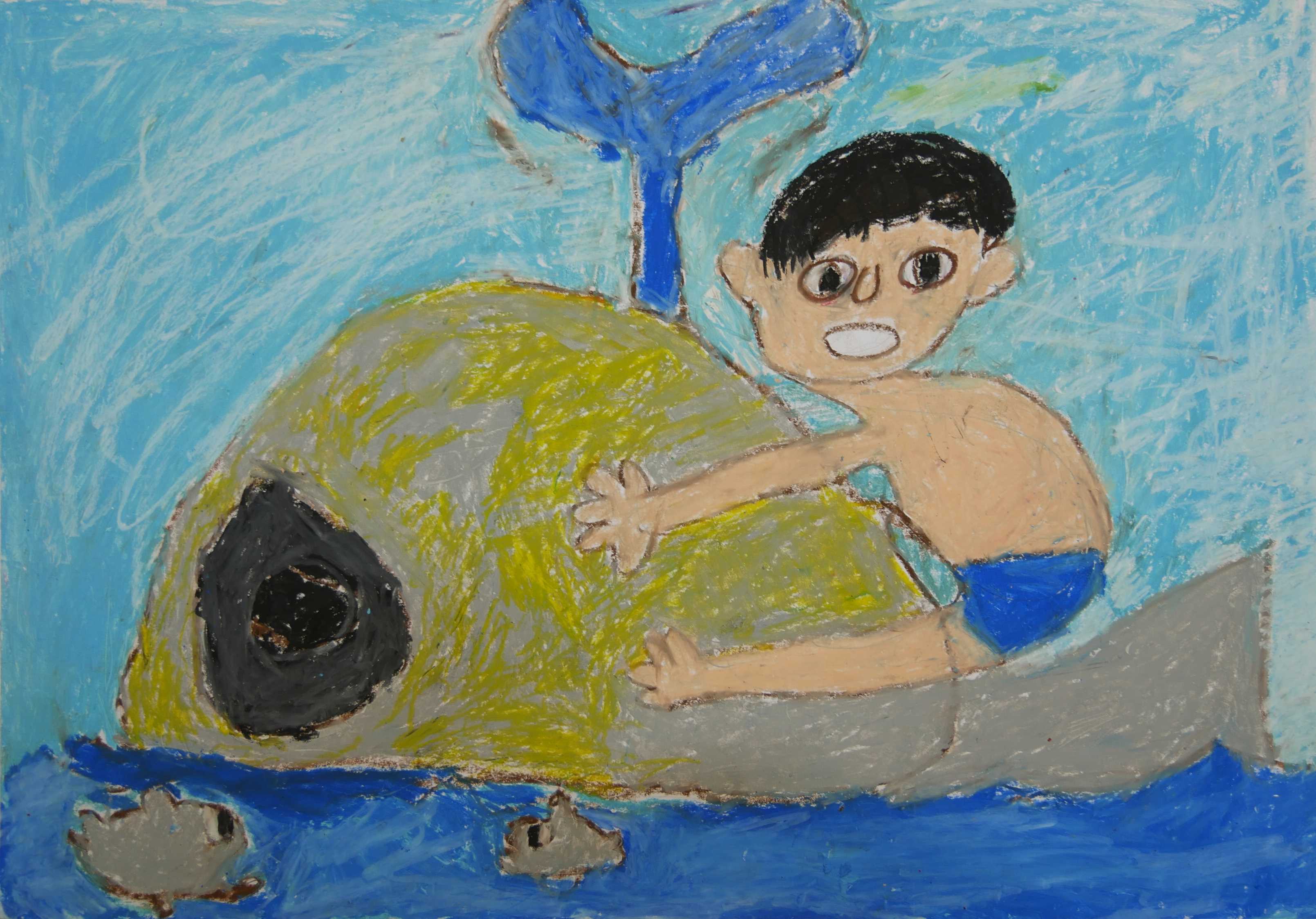 「泳いでいるのでしょうか。それとも潜っているのでしょうか?少年が生き物に語りかけ、生き物も少年にあいさつしています。」 |