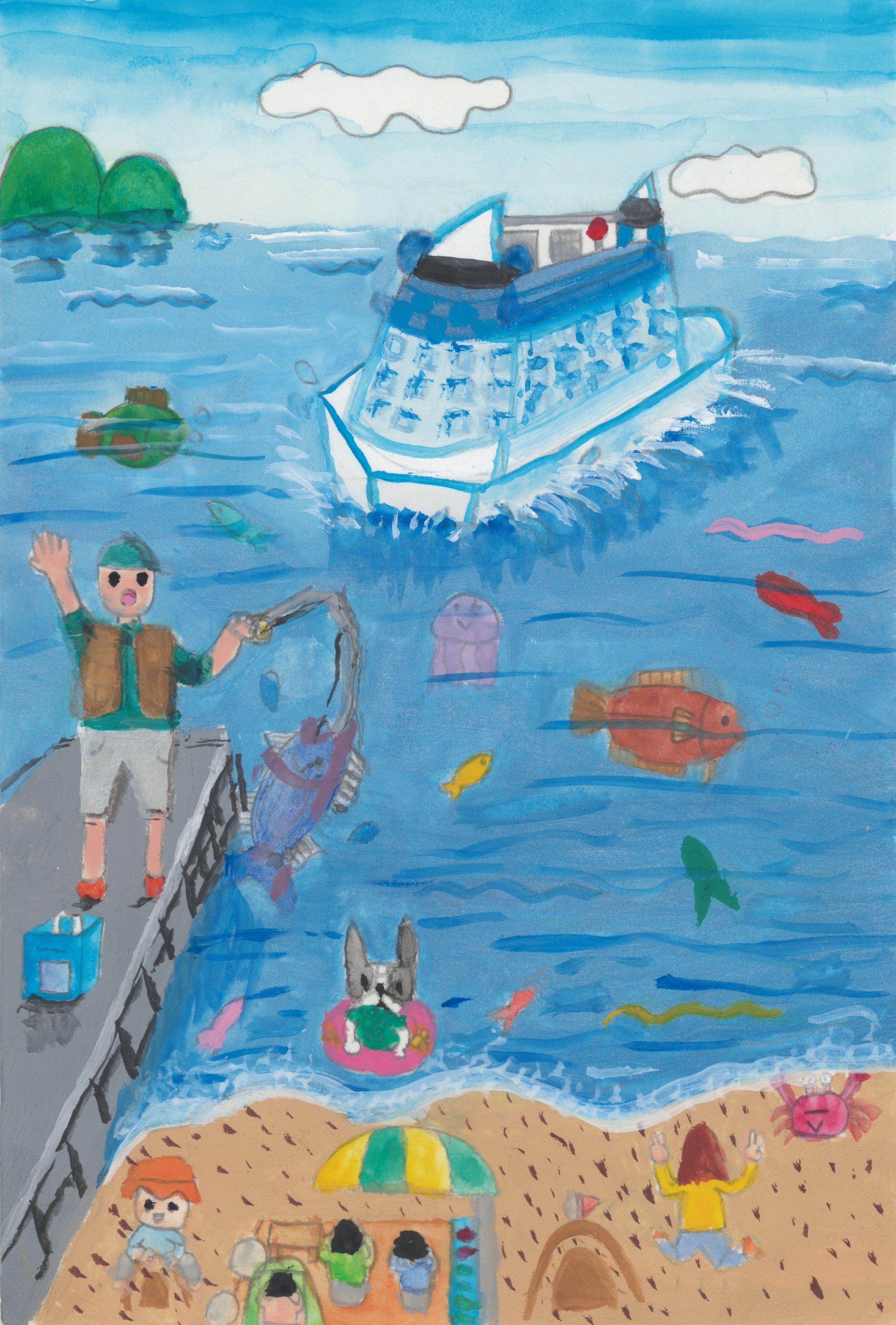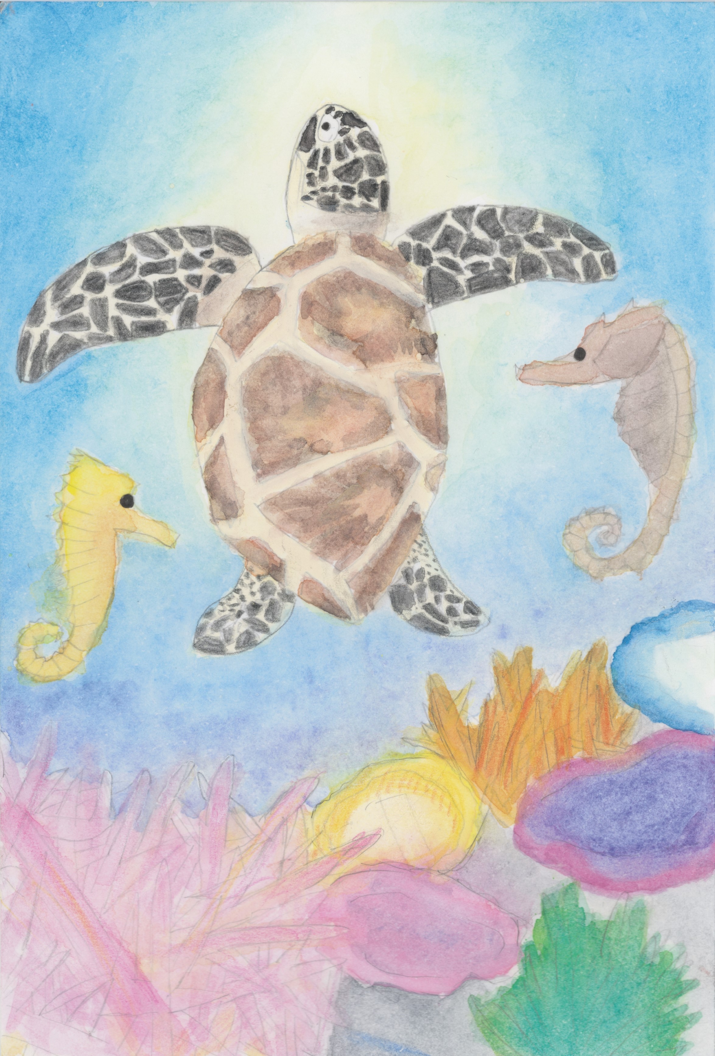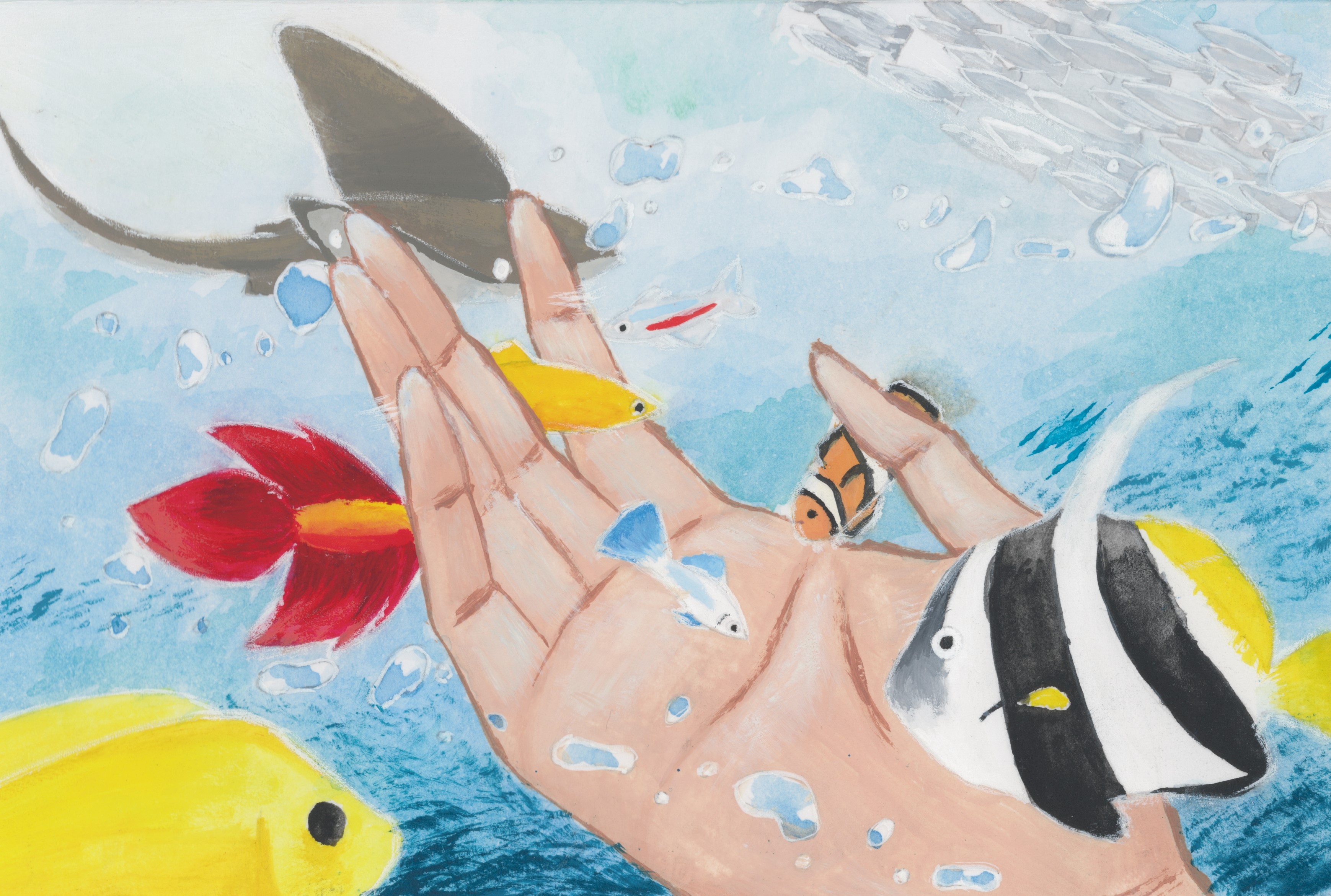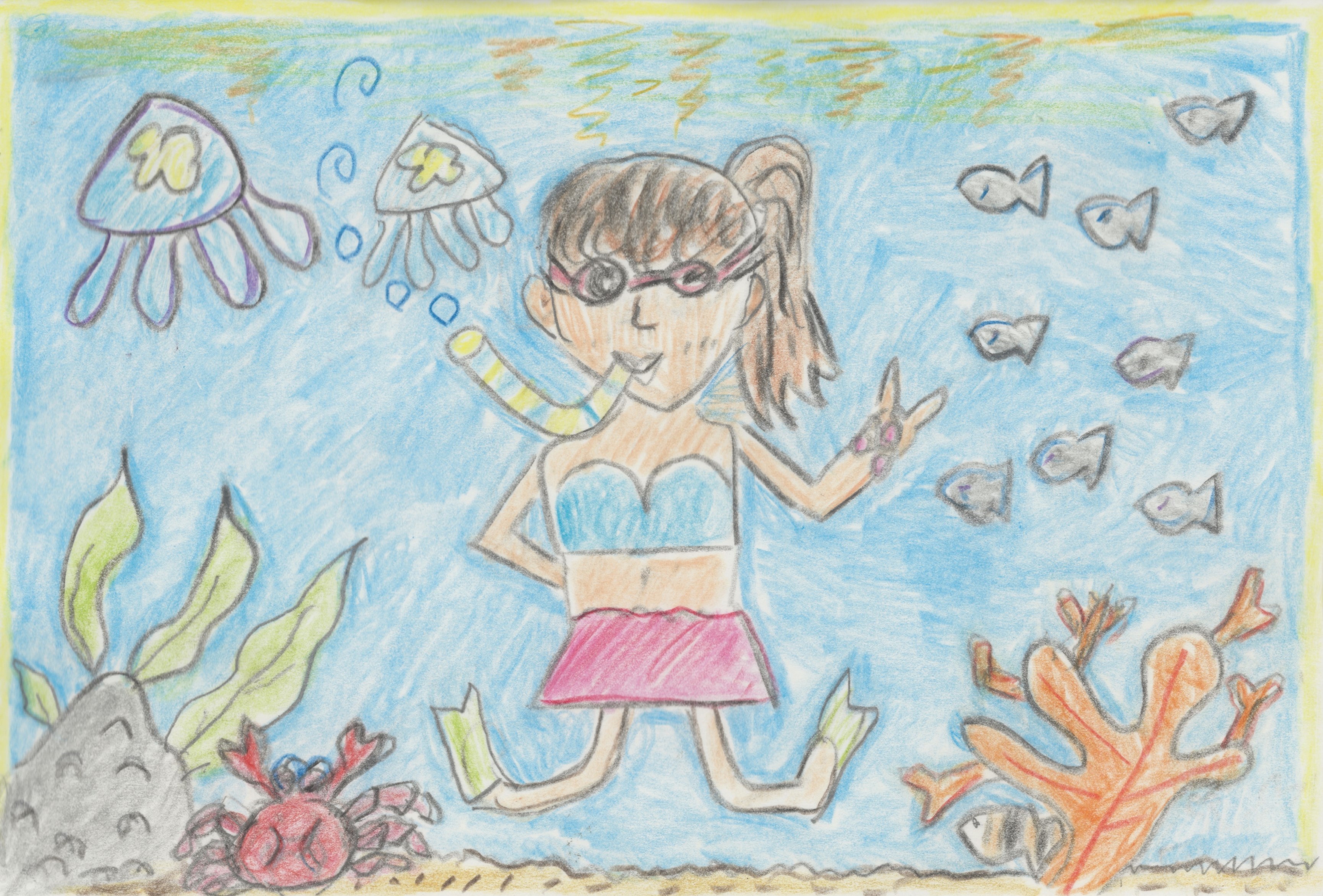 「画面一杯にテーマを描いています。シュノーケルで水中にいることを表現しています。」「きれいな海での海中散歩の楽しさが伝わってくるような作品です。」 |