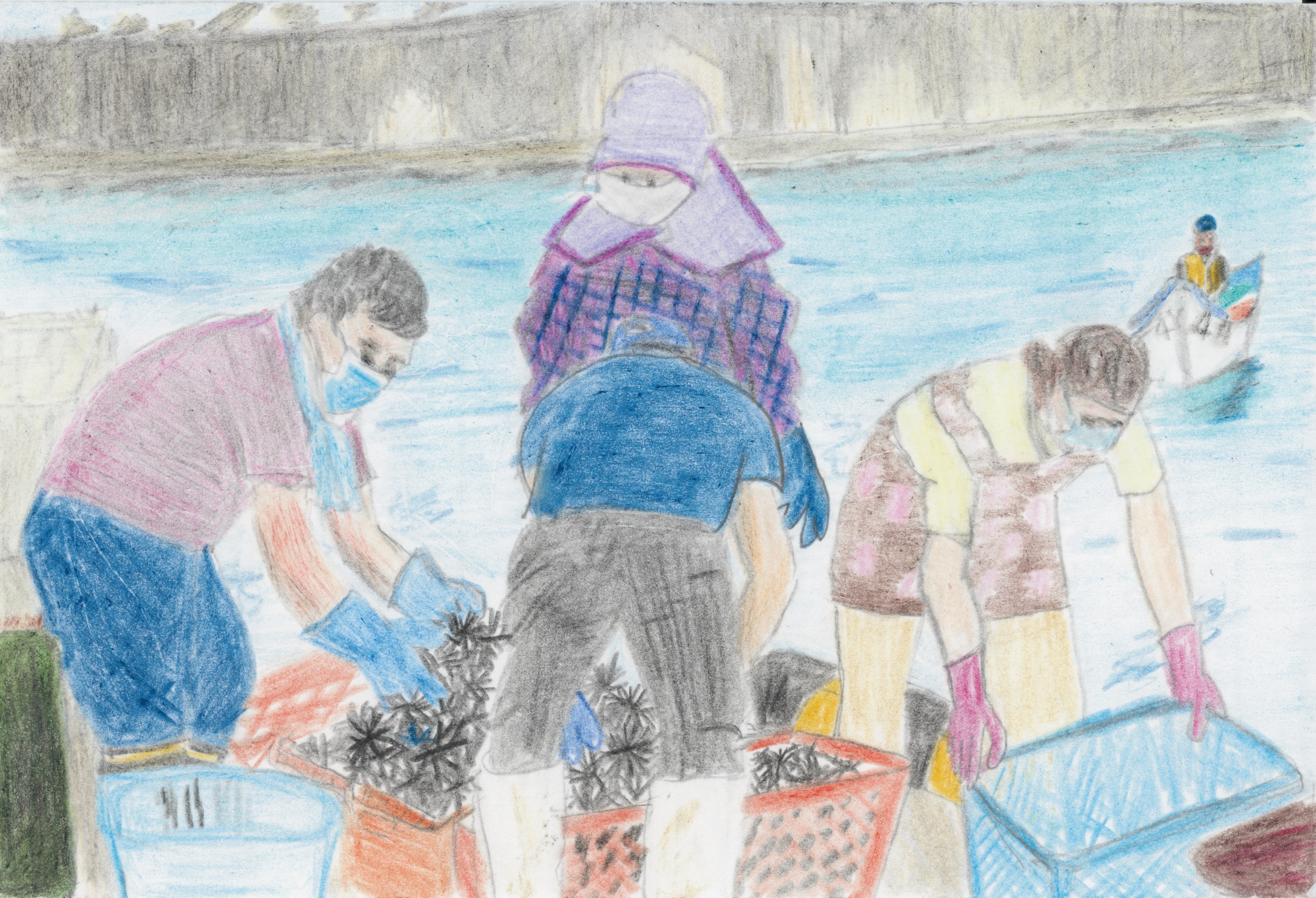 「マスクをして海で働く人は今しか見られない光景でしょう。身を屈めて働く人の姿勢などがよく表現されています。」「海辺で働く大人達の体の動きが上手に描けています。マスクをつけずに働ける日が早く来ると良いですね。」 |