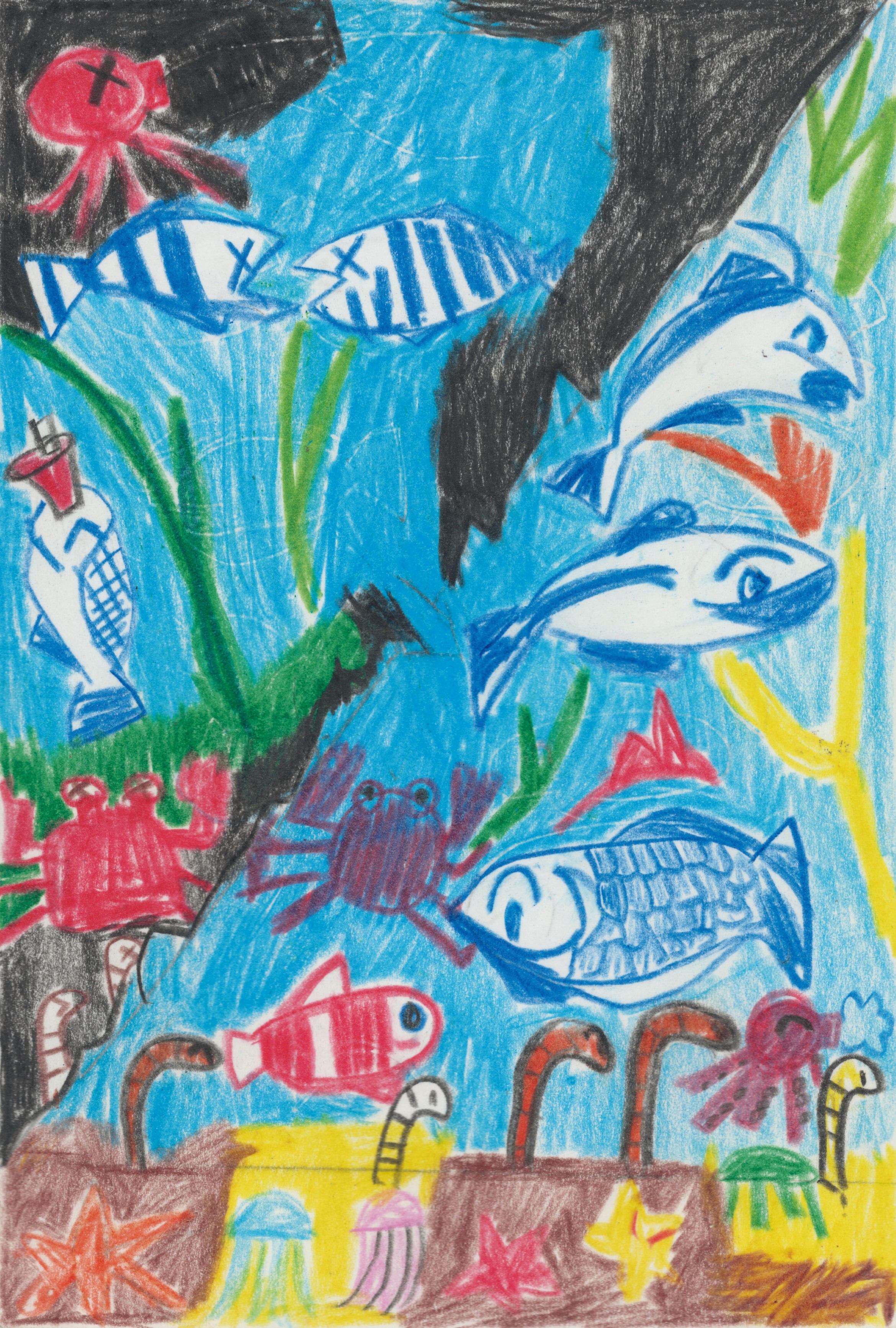 「洞窟の奥が暗くなっている様子や透明な海の中の様子が主観的に良く表現されています。」「海の中にたくさんの生物が描かれています。美しい洞窟でこのような生き物と出会えたら本当に楽しかったと思います。」 |