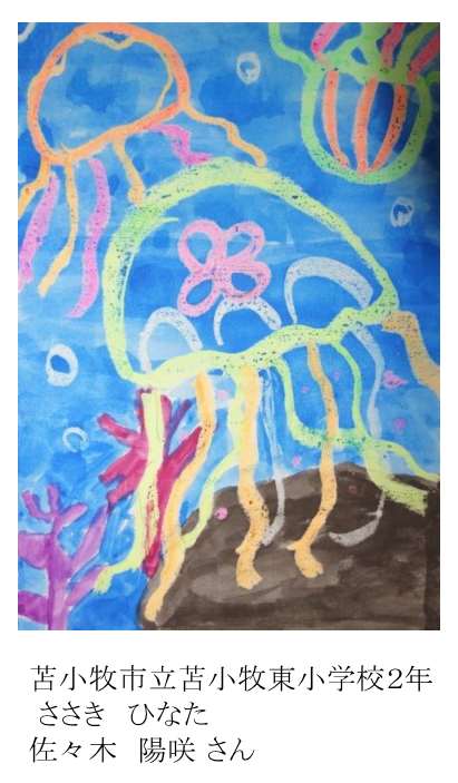 かわいい海の生き物をたくさんかきました。 ●特別審査員コメント 色使いがかわいらしく、生き物たちの表現とうまくマッチしています。朝か夕陽の色に染まった生き物たちが動いているようです。 |