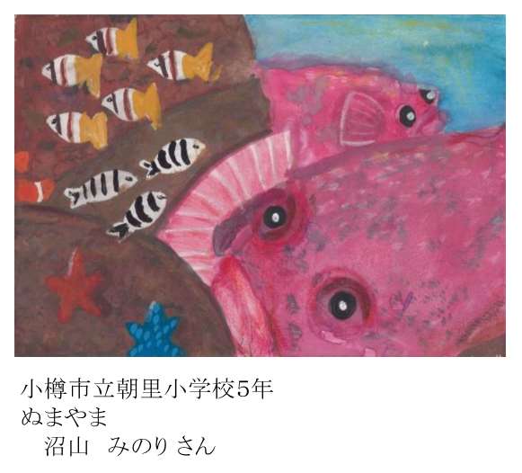 ●本人コメント 個性がある魚をかきたくて、ど派手なピンク色にしました。海の生きもの達も個性ゆたかで元気にすごしてほしいと思いをこめてかきました。 ●特別審査員コメント ギョロリと大きな目で見つめる先には、色彩やかな小魚やヒトデたち。でも心配しないで。そのまなざしには優しさが感じられます。 |