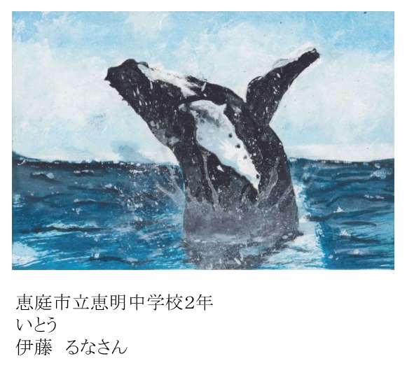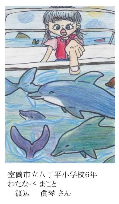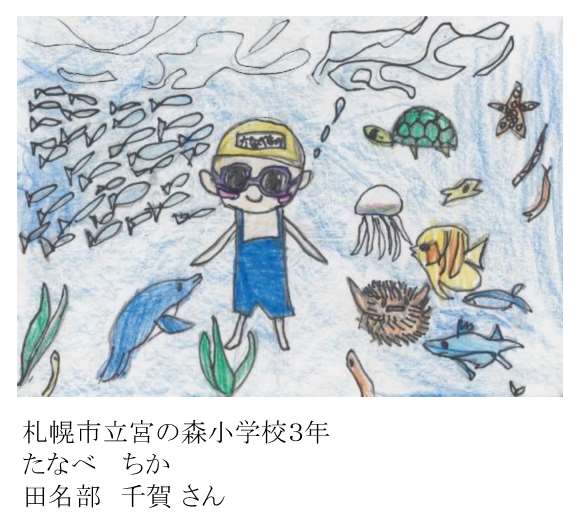 イルカウォッチングで野生のイルカを初めて見ました。元気に泳ぐイルカのいる海が、ずっと未来に残って欲しいと思い、この絵を描きました。 ●特別審査員コメント 作者が実際にイルカを見た経験を伝えたい気持ちが分かります。きっと指をさして「〇〇〇〇〇」と思わず言ってしまったのでしょう。絵の主人公は作者です。海の生き物との大切な時間を表現しています。 |