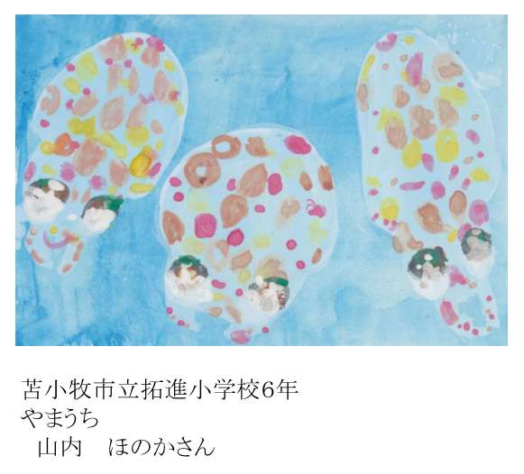 イカの子どもたち。 ●特別審査員コメント 面白い色、形、海の中には色々な生き物がいます。初めて見た時「イカなの?」と思ったのでしょう。これが動く姿も見てみたいですね。三匹のイカが、それぞれに個性があり、まるでクラスの友達のようです。 |