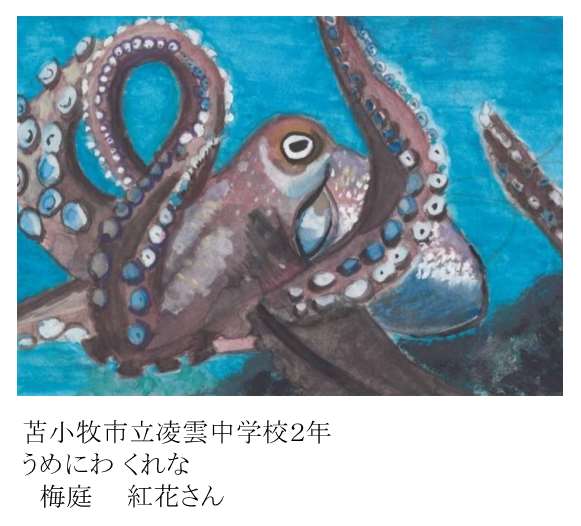 これからも海の生物が生き生きと暮らせたらいいなと思います。 ●特別審査員コメント タコの動きはダイナミックで映画や物語にも巨大なモンスターとして度々登場します。何かで見た映像からウネウネ動くタコの足が印象に残りモチーフになったのだと思います。色使いも工夫され、深い海にうごめくタコの生命力を表現しています。 |