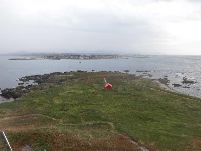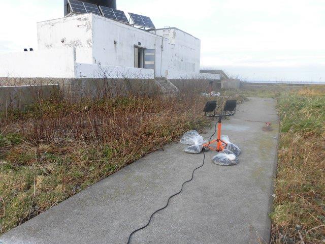 灯台の上から岬の方向を見定め「投光器」の配置を決定します。