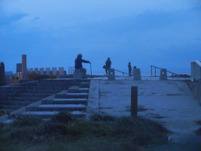 夕暮れ時の岬の広場。町内放送でライトアップを周知するという大間町の粋な計らいの甲