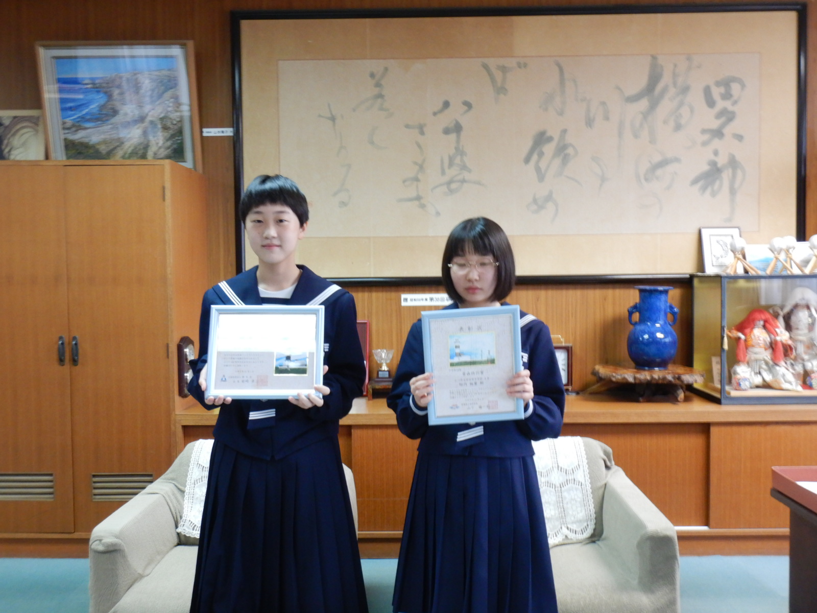 青森海上保安部では、公益社団法人燈光会が主催する「灯台絵画コンテスト2021」の開催にあわせ、同コンテスト入賞作品以外の作品のうち、「大間埼灯台のある風景」を描いた作品の中から特に優れた作品を選定のうえ表彰することとしておりましたところ、たくさんの応募があり、その中から入賞者が決まりましたので、ここにその入賞作品についてご紹介いたします。なお、都合により大間埼灯台点灯100周年記念式典に参加できなかったむつ市立田名部中学校の相内柚葉さん(青森特別賞:右)と髙田莉羅さん(銅賞:左)には、別途、同中学校にて青森海上保安部次長から賞状と副賞が伝達されました。