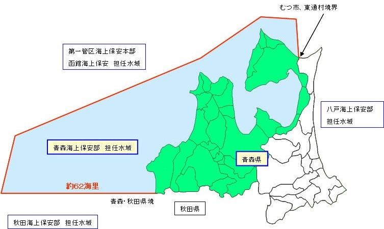 青森県深浦町からむつ市までの海岸線総延長約600kmの沿岸及び沖合海域を担当しています。