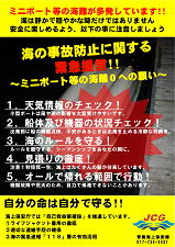 地元自治体にお願いして、ミニボート所有者が利用すると思われるエリアの公衆トイレにミニボート事故防止啓発ポスターを貼りつけさせていただきました。