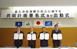 この状況に鑑み、青森海上保安部、青森県、青森県漁業協同組合連合会及び日本漁船保険組合青森県支所の関係4機関は、漁船での死亡事故等に焦点を当てた「重大漁船海難防止に関する共同計画書」を作成、署名し、令和2年2月26日から共同で計画的に重大漁船海難防止のために活動を開始しました。令和4年4月1日からは八戸海上保安部も加わり、5機関で青森県全体での共同活動を実施しています。