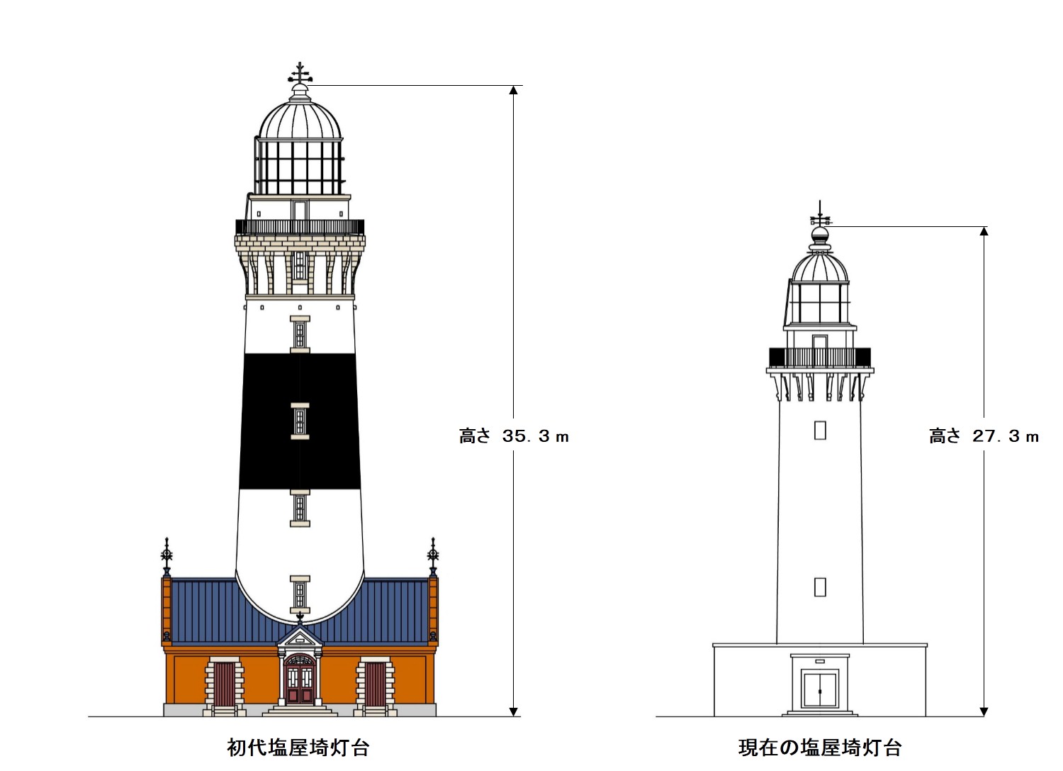| 塩屋埼近海は、昔から航海の難所と云われ、そのため遭難船が数多くあったことから、明治32年12月15日初代塩屋埼灯台が誕生しました。 西洋の技術を取り入れ建設されたこの灯台は、円形で・煉瓦造・高さ35.3メートルの高塔で(煉瓦造灯台としては歴代1位の高さ)、黒白横縞に塗られ、レンズはフランスから輸入された1等レンズで、灯油を燃やして23海里(42.6キロメートル)の遠方まで照らしました。(白黒写真は初代の塩屋埼灯台で、無線電信施設建設(昭和5年頃)以降撮影の写真) 参考図(PDF、JPEG) |