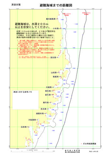 津波からの避難海域は水深200m上が目安となっていますので、津波に遭遇するまでに、避難水域に自船が到達できない場合は、陸上への避難を選択することも考慮してください。
