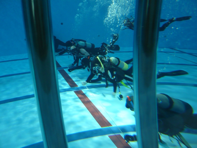 平成21年2月3日午前、横浜海上防災基地訓練水槽において、清水海上保安部「巡視船おきつ」潜水士4名の指導により、神奈川県水難救済会西神奈川広域救難所ダイバー5名と千葉県水難救済会房総広域救難所ダイバー12名が合同で潜水訓練を実施しました。