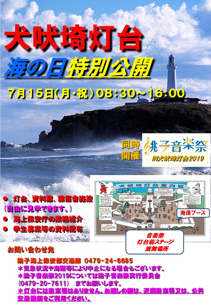 イベント内容 1 犬吠埼灯台・資料館・霧笛舎の施設見学 2 海上保安官ミニ制服試着体験 3 海上保安官の業務紹介 4 学生募集等の資料配布 5 海の安全啓発活動 6 同時開催:銚子音楽祭in犬吠埼灯台2019 ※開催日時は予告なく変更することがあります。 ※気象状況や海難等により中止になる場合もあります。 ※灯台には駐車場はありません。お越しの際は、近隣駐車場又は、公共交通機関をご利用ください。 |