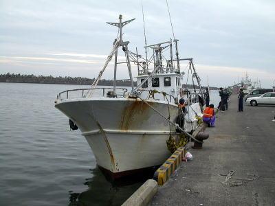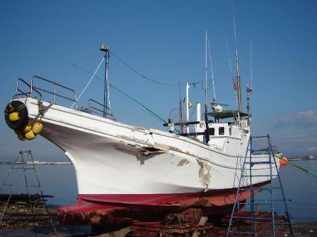 | 乗揚げ漁船 | 離礁作業の様子 |