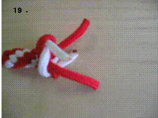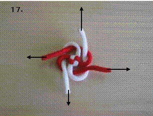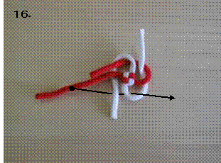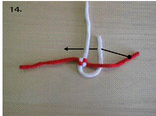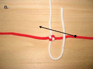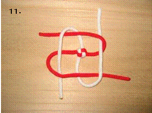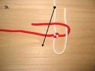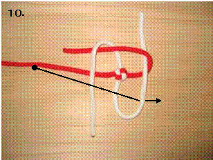 左のロープを右に折り曲げます。この時、7.で折り曲げたロープの下をくぐらせます。