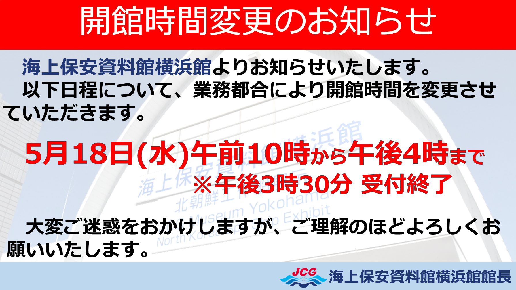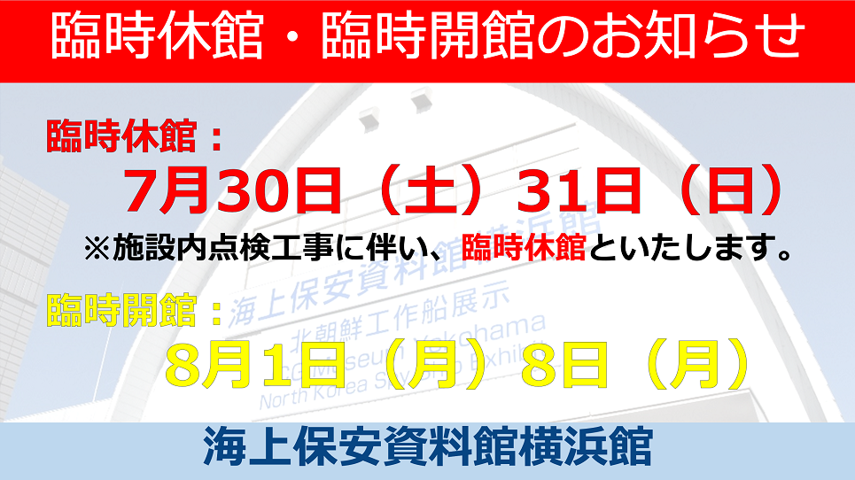 2022.07.21 お知らせ 海上保安資料館横浜館(臨時休館・臨時開館情報) 施設内点検工事に伴い、以下のとおり臨時休館及び臨時開館いたします。大変ご迷惑をおかけしますが、ご理解のほどよろしくお願い申し上げます。 臨時休館:7月30日(土)、31日(日) 臨時開館:8月1日(月)、8日(月) ▼資料はこちら 海上保安資料館臨時休館及び臨時開館のお知らせ ホーム 新着情報 お知らせ 海上保安資料館横浜館(臨時休館・臨時開館情報)