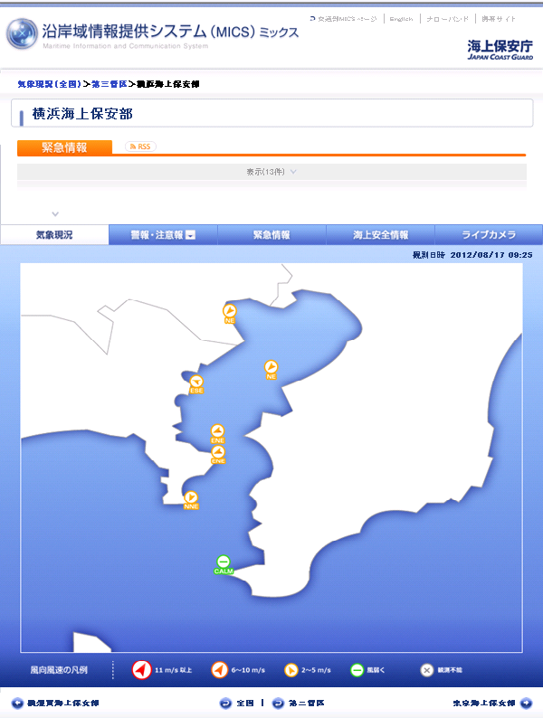 海上保安庁では、プレジャーボートや漁船などの船舶運航者やマリンレジャー愛好者の方々に対して、全国各地の灯台などで観測した風向、風速、波高などの局地的な気象・海象の現況、海上工事の状況、海上模様が把握できるライブカメラなどの「海の安全情報」をリアルタイムに提供しています。