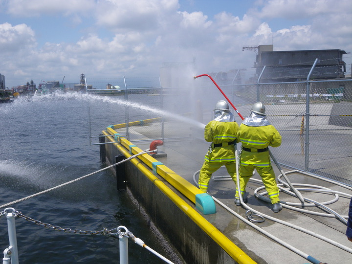 これは派遣消火訓練といって、隊員が火災船等(火元)に乗り込んでいって消火することを想定した訓練です。