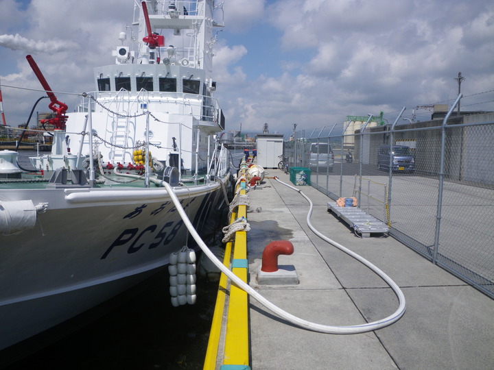 巡視艇から消火ホースを延ばし、二人の隊員がそれぞれ放水していますが、水の出方が違いますよね!