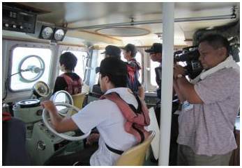 鑑識業務体験では、実際に指紋採取にもチャレンジ、ロープワーク等を学んだあと、巡視艇まきぐもに乗船して鳥羽湾内をパトロール、操船も体験してもらいました。