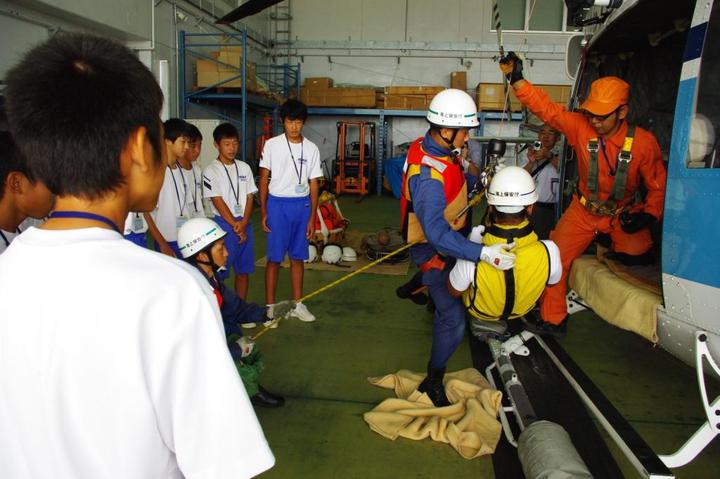 ヘリコプター格納庫では、ヘリコプターの説明を受けた後、潜水士と一緒に吊上げ救助訓練を体験、救助する側と救助される側とに分かれて実施しました。