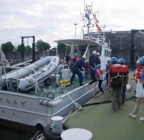 名古屋市港区総合防災訓練において、避難住民を搬送する「巡視艇しゃちかぜ」